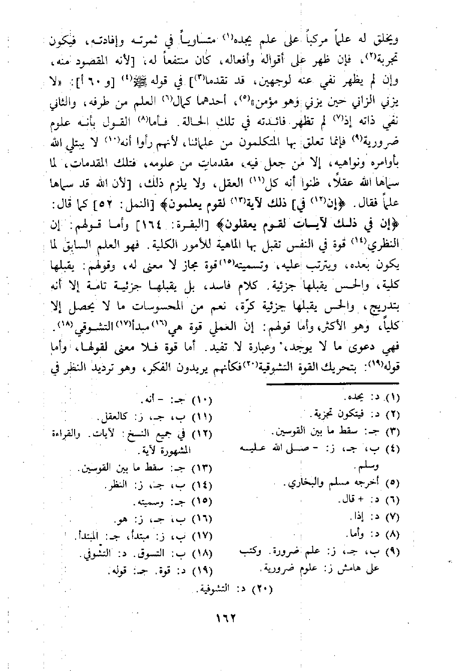 ويخلق له علما مركبا على علم يجده (¬1) متساويا في ثمرته وإفادته، فيكون تجربة (¬2)، فإن ظهر على أقواله وأفعاله، كان منتفعا له، [لأنه المقصود منه، وإن لم يظهر نفي عنه لوجهين، قد تقدما (¬3)] في قوله - صلى الله عليه وسلم - (¬4) [و 60 أ]: "لا يزني الزاني حين يزني وهو مؤمن" (¬5)، أحدهما كمال (¬6) العلم من طرفه، والثاني نفي ذاته إذ (¬7) لم تظهر فائدته في تلك الحالة. فأما (¬8) القول بأنه علوم ضرورية (¬9) فإنما تعلق بها المتكلمون من علمائنا، لأنهم رأوا أنه (¬10) لا يبتلي الله بأوامره ونواهيه، إلا من جعل فيه، مقدمات من علومه، فتلك المقدمات، لما سماها الله عقلا، ظنوا أنه كل (¬11) العقل، ولا يلزم ذلك، [لأن الله قد سماها علما فقال. {إن (¬12) في] ذلك لآية (¬13) لقوم يعلمون} [النمل: 52] كما قال: {إن في ذلك لآيات لقوم يعقلون} [البقرة: 164] وأما قولهم: إن النظري (¬14) قوة في النفس تقبل بها الماهية للأمور الكلية. فهو العلم السابق لا يكون بعده، ويترتب عليه، وتسميته (¬15) قوة مجاز لا معنى له، وقولهم: يقبلها كلية، والحس يقبلها جزئية. كلام فاسد، بل يقبلها جزئية تامة إلا أنه بتدريج، والحس يقبلها جزئية كرة، نعم من المحسوسات ما لا يحصل إلا كليا، وهو الأكثر، وأما قولهم: إن العملي قوة هي (¬16) مبدأ (¬17) التشوقي (¬18). فهي دعوى ما لا يوجد، وعبارة لا تفيد. أما قوة فلا معنى لقولها، وأما قوله (¬19): بتحريك القوة التشوقيه (¬20) فكأنهم يريدون الفكر، وهو ترديد النظر في