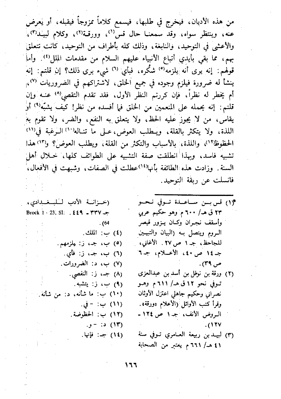 من هذه الأديان، فيخرج في طلبها، فيسمع كلاما ممزوجا فيقبله، أو يعرض عنه، وينتظر سواه، وقد سمعنا حال قس (¬1)، وورقة (¬2)، وكلام لبيد (¬3)، والأعشى في التوحيد، والنابغة، وذلك كله بأطراف من التوحيد، كانت تتعلق بهم، مما بقي بأيدي أتباع الأنبياء عليهم السلام من مقدمات الملل (¬4). وأما قولهم: إنه يرى أنه يلزمه (¬5) شكره، فبأي (¬6) شيء يرى ذلك؟ إن قلتم: إنه ينشأ له ضرورة فيلزم وجوده في جميع الخلق، لاشتراكهم في الضروريات (¬7)، أم يخطر له نظرا، فإن كررتم النظر الأول، فقد تقدم التقصي (¬8) عنه وإن قلتم: إنه يحمله على المنعمين من الخلق فما أفسده من نظر! كيف يشبه (¬9) أو يقاس، من لا يجوز عليه الحظ، ولا يتعلق به النفع، والضر، ولا تقوم به اللذة، ولا يتكثر بالقلة، ويطلب العوض، على ما تناله (¬10) الرغبة في (¬11) الحظوظ (¬12)، واللذة، بالأسباب والتكثر من القلة، ويطلب العوض؟ و (¬13) هذا تشبيه فاسد، وبهذا انطلقت صفة التشبيه على الطوائف كلها، خلال أهل السنة. وزادت هذه الطائفة بأنها (¬14) عطلت في الصفات، وشبهت في الأفعال، فانسلت عن ربقة التوحيد.