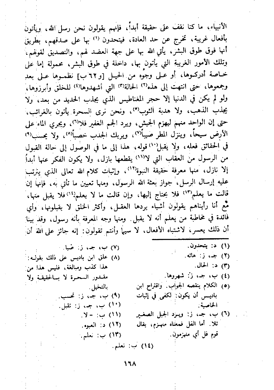 الأنبياء، ما كنا نقف على حقيقة أبدا، فإنهم يقولون نحن رسل الله، ويأتون بأفعال غريبة، تخرج عن حد العادة، فيتحدون (¬1) بها على صدقهم، بطريق أنها فوق طوق البشر، يأتي الله بها على جهة العضد لهم، والتصديق لقولهم، وتلك الأمور الغريبة التي يأتون بها، داخلة في طوق البشر، محمولة إما على خاصة أدركوها، أو على وجوه من الحيل [و 62 ب]، نظموها على بعد وجمعوها، حتى انتهمت إلى هذه (¬2) الحالة (¬3) التي أشهدوها (¬4) للخلق وأبرزوها، ولو لم يكن في الدنيا إلا حجر المغناطيس الذي يجذب الحديد من بعد، ولا يجذب الذهب، ولا هدبة الثوب (¬5)، ونحن نرى السحرة يأتون بالغرائب، حتى إن الواحد منهم ليهزم الجيش، ويرد الجم الغفير فلا (¬6)، ويجري الماء على الأرض سيحا، وينزل المطر صيبا (¬7)، ويريك الجدب خصبا (¬8)، ولا يحسب (¬9) في الحقائق فعله، ولا يقبل (¬10) قوله، هذا إلى ما في الوصول إلى حالة القبول من الرسول من العقاب التي لا (¬11) يقطعها بازل، ولا يكون الفكر عنها أبدا إلا نازل، منها معرفة حقيقة النبوة (¬12)، وإثبات كلام الله تعالى الذي يترتب عليه إرسال الرسل، جواز بعثة الله الرسول، ومنها تعيين ما تأتي به، فإنها إن قالت ما يعلم (¬13) فلا يحتاج إليها، وإن قالت ما لا يعلم (¬14) فلا يقبل منها، مع أنا رأيناهم يقولون أشياء يردها العقل، وأكثر الخلق لا يقبلونها، وأي فائدة في مخاطبة من يعلم أنه لا يقبل. ومنها وجه المعرفة بأنه رسول، وقد بينا أن ذلك يعسر، لاشتباه الأفعال، لا سيما وأنتم تقولون: إنه جائز على الله أن