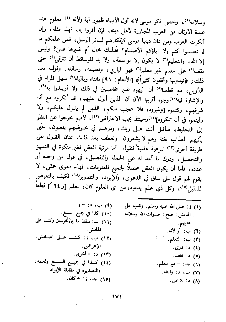 وسلامه (¬1)، وخص ذكر موسى لأنه أول الأنبياء ظهور آية ولأنه (¬2) معلوم عند عبدة الأوثان من العرب المجاورة لأهل دينه، فإن أقروا به، فهذا مثله، وإن أنكرت العرب ومن وإن دينها موسى كإنكارهم لسائر الرسل، فمن علمكم ما لم تعلموا أنتم ولا آباؤكم الأصنام؟ فذلك محال أم غيرها فمن؟ وليس إلا الله، والتعليم (¬3) لا يكون إلا بواسطة، ولا بد للوسائط أن تترقى (¬4) حتى تقف (¬5) على معلم غير معلم (¬6) فهو الباري، وتعليمه، رسالته. وقوله بعد ذلك: {تبدونها وتخفون كثيرا} [الأنعام: 91] بالتاء وبالياء (¬7) سهل المرام في التأويل، مع قطعنا (¬8) أن اليهود غير مخاطبين في ذلك ولا أريدوا به (¬9). والإشارة فيه (¬10) وجوه أقربها الآن أن الذين أنزل عليهم، قد أنكروه مع أنه شرفهم، وكتموه [وغيروه، فلا عجب منكم، الذين لم ينزل عليكم، ولا رأيتموه في أن تنكروه] (¬11) وحينئذ يجب الاعتراض (¬12)، لأنهم خرجوا عن النظر إلى التخليط، فأقبل أنت على ربك، وذرهم في خوضهم يلعبون، حتى يأتيهم العذاب بغتة وهم لايشعرون. ونعطف بعد ذلك عنان القول على طريقة أخرى (¬13) شرعية عقلية فنقول: أما مرتبة العقل فغير منكرة في التمييز والتحصيل، ودرك ما أعد له على الجملة والتفصيل، في قول من وحده أو عدده، فأما أن يكون العقل محصلا لجميع المعلومات، فهذه دعوى حمقى، لا يقوم لهم قول على ساق في الدعوى، والإيراد، والتصوير (¬14) فكيف بالتعرض للدليل (¬15)، وكل ذي علم يدعيه، من أي العلوم كان، يعلم [و 64 أ] قطعا