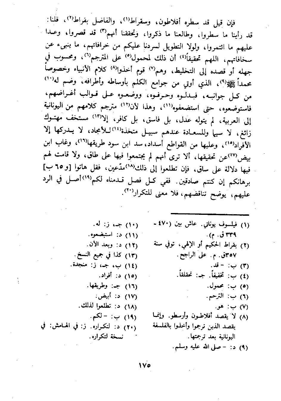 فإن قيل قد سطره أفلاطون، وسقراط (¬1)، والفاضل بقراط (¬2)، قلنا: قد رأينا ما سطروا، وطالعنا ما ذكروا، وتحققنا أنهم (¬3) قد قصروا، وعدا عليهم ما ائتمروا، ولولا التطويل لسردنا عليكم من خرافاتهم، ما ينبئ عن سخافاتهم، الله م تحقيقا (¬4) أن ذلك لمحمول (¬5) على المترجم (¬6)، ومحسوب في جهله أو قصده إلى التخليط، وهم (¬7) قوم أخذوا (¬8) كلام الأنبياء وخصوصا محمدا - صلى الله عليه وسلم - (¬9)، الذي أوتي من جوامع الكلم بأوساطه وأطرافه، وضم له (¬10) من كل جوانبه، فبدلوه وحرفوه، ووضعوه على قوالب أغراضهم، فاستوضعوه، حتى استضعفوه (¬11)، وهذا لأن (¬12) مترجم كلامهم من اليونانية إلى العربية، لم يتوله عدل، بل فاسق، بل كافر، إلا (¬13) مستخف مهتوك زائغ، لا سيما وللسعادة عندهم سبيل متخذة (¬14) للأمجاد، لا يدركها إلا الأفراد (¬15)، وعليها من القواطع أسداد، سد ابن سود طريقها (¬16)، وغاب ابن بيض (¬17) عن تحقيقها، ألا ترى أنهم لم يجتمعوا فيها على طاق، ولا قامت لهم فيها دلالة على ساق، فإن تطلعوا إلى ذلك (¬18) مدعين، فقل هاتوا [و 65 ب] برهانكم إن كنتم صادقين. ففي كل فصل قدمناه لكم (¬19) أصل في الرد عليهم، يوضح تناقضهم، فلا معنى للتكرار (¬20).