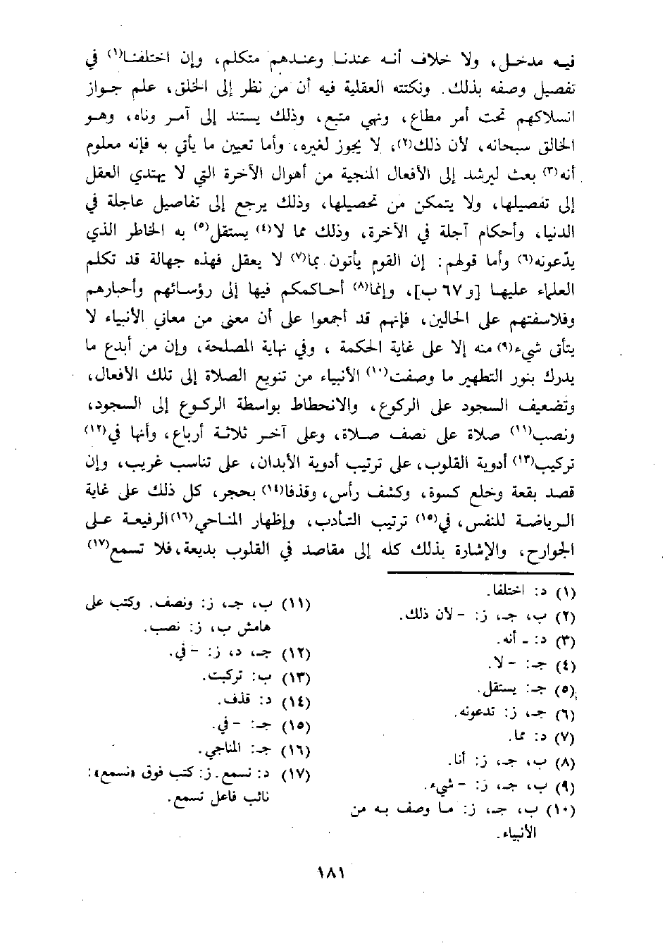 فيه مدخل، ولا خلاف أنه عندنا وعندهم متكلم، وإن اختلفنا (¬1) في تفصيل وصفه بذلك. ونكتته العقلية فيه أن من نظر إلى الخلق، علم جواز انسلاكهم تحت أمر مطاع، ونهي متبع، وذلك يستند إلى آمر وناه، وهو الخالق سبحانه، لأن ذلك (¬2)، لا يجوز لغيره، وأما تعيين ما يأتي به فإنه معلوم أنه (¬3) بعث ليرشد إلى الأشعال المنجية من أهوال الآخرة التي لا يهتدي العقل إلى تفصيلها، ولا يتمكن من تحصيلها، وذلك يرجع إلى تفاصيل عاجلة في الدنيا، وأحكام آجلة في الآخرة، وذلك مما لا (¬4) يستقل (¬5) به الخاطر الذي يدعونه (¬6) وأما قولهم: إن القوم يأتون بما (¬7) لا يعقل فهذه جهالة قد تكلم العلماء عليها [و 67 ب]، وإنما (¬8) أحاكمكم فيها إلى رؤسائهم وأحبارهم وفلاسفتهم على الحالين، فإنهم قد أجمعوا على أن معنى من معاني الأنبياء لا يتأتى شيء (¬9) منه إلا على غاية الحكمة، وفي نهاية المصلحة، وإن من أبدع ما يدرك بنور التطهير ما وصفت (¬10) الأنبياء من تنويع الصلاة إلى تلك الأفعال، وتضعيف السجود على الركوع، والانحطاط بواسطة الركوع إلى السجود، ونصب (¬11) صلاة على نصف صلاة، وعلى آخر ثلاثة أرباع، وأنها في (¬12) تركيب (¬13) أدوية القلوب، على ترتيب أدوية الأبدان، على تناسب غريب، وإن قصد بقعة وخلع كسوة، وكشف رأس، وقذفا (¬14) بحجر، كل ذلك على غاية الرياضة للنفس، في (¬15) ترتيب التأدب، وإظهار المناحي (¬16) الرفيعة على الجوارح، والإشارة بذلك كله إلى مقاصد في القلوب بديعة، فلا تسمع (¬17)