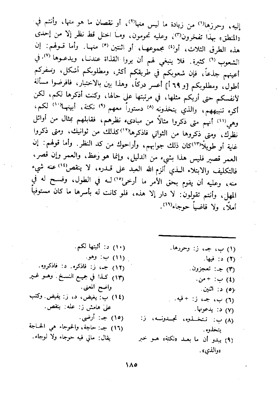 إليه، وحرزها (¬1) من زيادة ما ليس منها (¬2)، أو نقصان ما هو منها، وأنتم في "المنطق" بهذا تفخرون (¬3)، وعليه تحومون، وما اختل قط نظر إلا من إحدى هذه الطرق الثلاث، أو (¬4) مجموعها، أو اثنتين (¬5) منها. وأما قولهم: إن الشعوب (¬6) كثيرة. فلا ينبغي لهم أن يروا القذاة عندنا، ويدعوها (¬7) في أعينهم جذعا، فإن شعوبكم في طريقكم أكثر، ومطلوبكم أشكل، وسفركم أطول، ومطلوبكم [و 69 أ] أعسر دركا، وهذا بين بالاختبار، فافرضوا مسألة لأنفسكم حتى أريكم مثلها، في مرتبتها على حالها، وكنت أذكرها لكم، لكن أكره تنبيههم، والذي يتخذونه (¬8) دستورا معهم (¬9) نكتة، أبينها (¬10) لكم، وهي (¬11) أنهم متى ذكروا مثالا من مبادئ نظرهم، فقابلهم بمثال من أوائل نظرك، ومتى ذكروها من الثواني فاذكرها (¬12) كذلك من ثوانيك، ومتى ذكروا غاية أو طويلا (¬13) كان ذلك جوابهم، وأراحوك من كد النظر. وأما قولهم: إن العمر قصير فليس هذا بشيء من الدليل، وإنما هو وعظ، والعمر وإن قصر، فالتكليف والابتلاء الذي ألزم الله العبد على قدره، لا ينقص (¬14) عنه شيء منه، وعلمه أن يقوم بحق الأمر ما أرخى (¬15) له في الطول، وفسح له في المهل، وأنتم تقولون: لا دار إلا هذه، فلو كانت له بأسرها ما كان مستوفيا أملا، ولا قاضيا حوجاء (¬16).