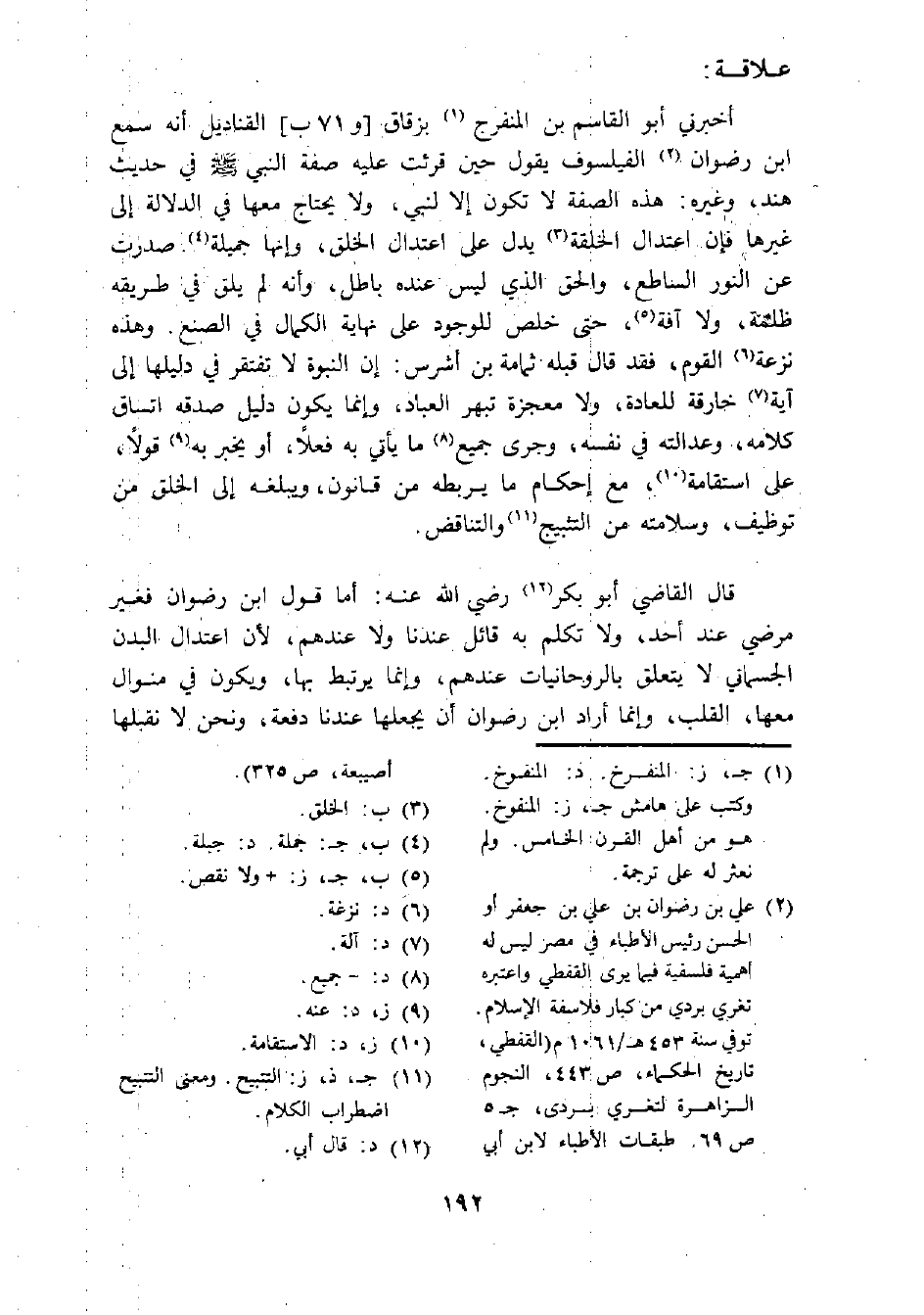 قال القاضي أبو بكر (¬12) رضي الله عنه: أما قول ابن رضوان فغير مرضي عند أحد، ولا تكلم به قائل عندنا ولا عندهم، لأن اعتدال البدن الجسماني لا يتعلق بالروحانيات عندهم، وإنما يرتبط بها، ويكون في منوال معها، القلب، وإنما أراد ابن رضوان أن يجعلها عندنا دفعة، ونحن لا نقبلها