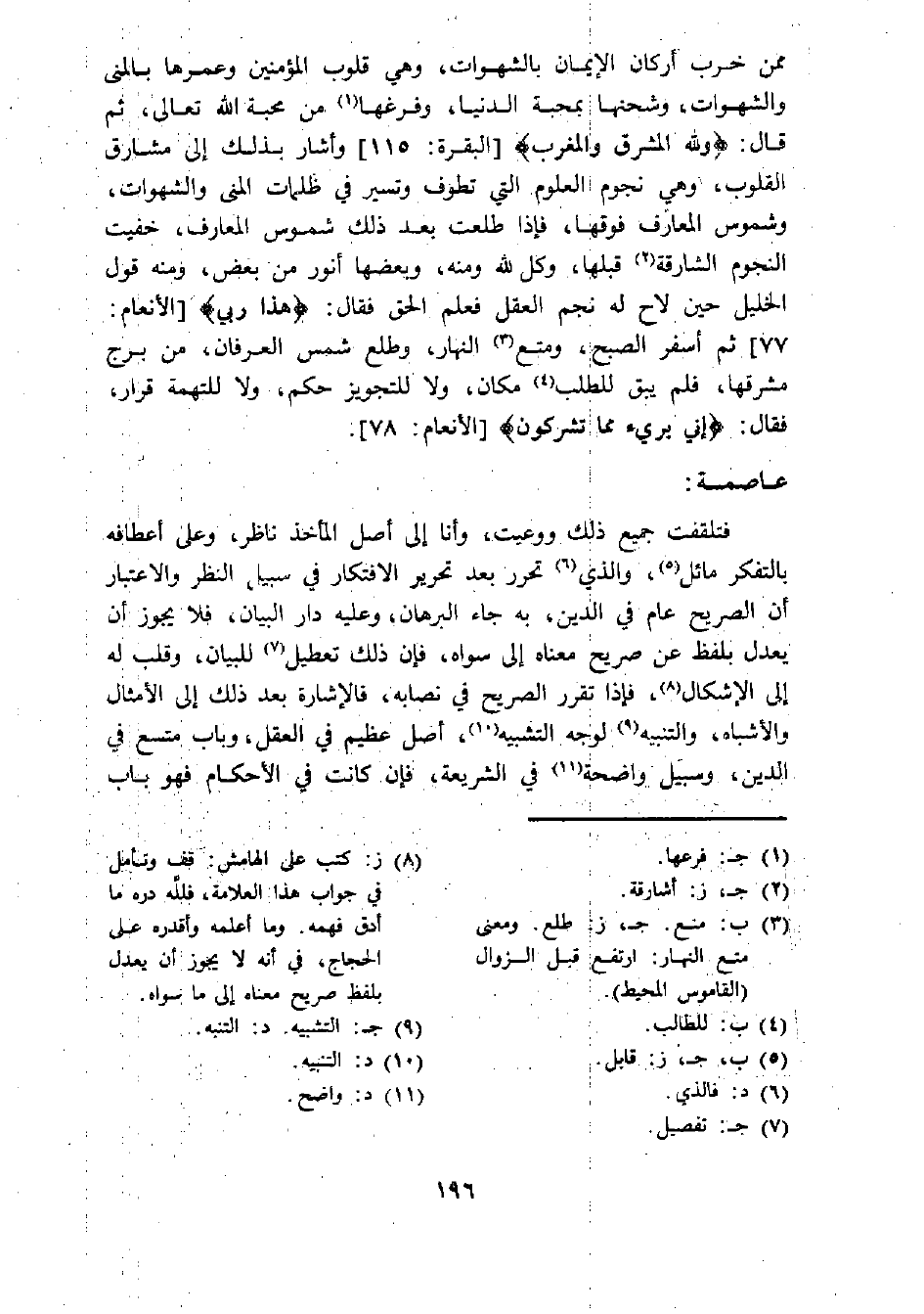 ممن خرب أركان الإيمان بالشهوات، وهي قلوب المؤمنيين وعمرها بالمنى والشهوات، وشحنها بمحبة الدنيا، وفرغها (¬1) من محبة الله تعالى، ثم قال: {ولله المشرق والمغرب} [البقرة: 115] وأشار بذلك إلى مشارق القلوب، وهي نجوم العلوم التي تطوف وتسير في ظلمات المنى والشهوات، وشموس المعارف فوقها، فإذا طلعت بعد ذلك شموس المعارف، خفيت النجوم الشارقة (¬2) قبلها، وكل لله ومنه، وبعضها أنور من بعض، ومنه قول الخليل حين لاح له نجم العقل فعلم الحق فقال: {هذا ربي} [الأنعام: 77] ثم أسفر الصبح، ومتع (¬3) النهار، وطلع شمس العرفان، من برج مشرقها، فلم يبق للطلب (¬4) مكان، ولا للتجويز حكم، ولا للتهمة قرار، فقال: {إني بريء مما تشركون} [الأنعام: 78].