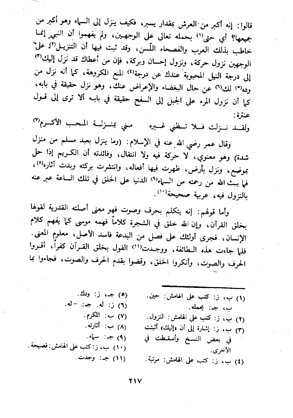قالوا: إنه أكبر من العرش بمقدار يسير، فكيف ينزل إلى السماء وهو أكبر من جميعها؟ أي حتى (¬1) بحمله تعالى على الوجهين، ولم يفهموا أن النبي إنما خاطب بذلك العرب والفصحاء اللسن، وقد ثبت فيها أن التنزيل (¬2) على الوجهين نزول حركة، ونزول إحسان وبركة، فإن من أعطاك قد نزل إليك (¬3) إلى درجة النيل المحبوبة عندك عن درجة (¬4) المنع المكروهة، كما أنه نزل من وده (¬5) لك (¬6) عن حال البغضاء والإعراض عنك، وهو نزل حقيقة في بابه، كما أن نزول المرء على الجبل إلى السفح حقيقة في بابه ألا ترى إلى قول عنترة: