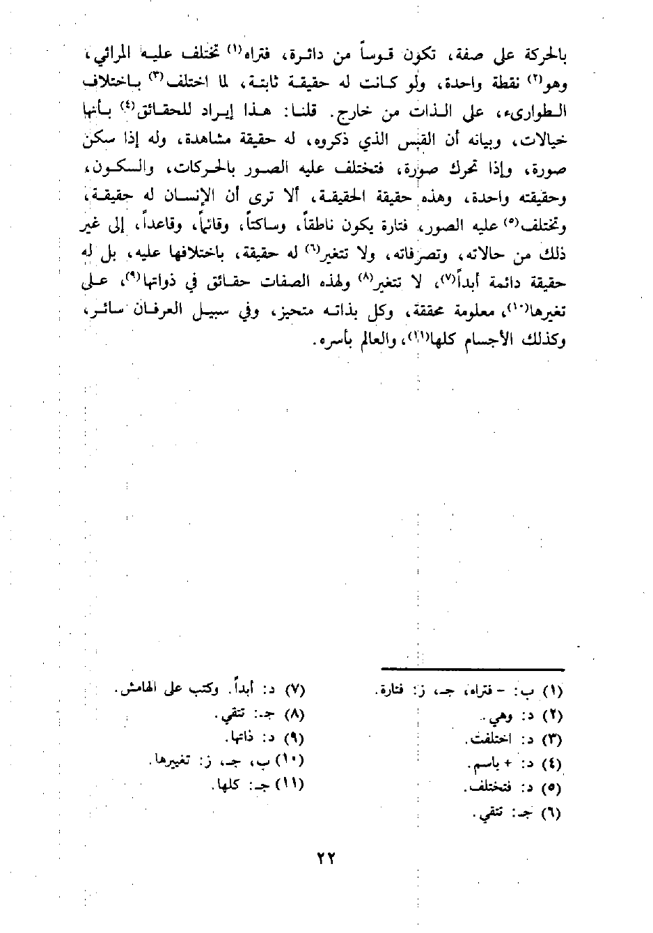 بالحركة على صفة، تكون قوسا من دائرة، فتراه (¬1) تختلف عليه المرائي، وهو (¬2) نقطة واحدة، ولو كانت له حقيقة ثابتة، لما اختلف (¬3) باختلاف الطوارئ، على الذات من خارج. قلنا: هذا إيراد للحقائق (¬4) بأنها خيالات، وبيانه أن القبس الذي ذكروه، له حقيقة مشاهدة، وله إذا سكن صورة، وإذا تحرك صورة، فتختلف عليه الصور بالحركات، والسكون، وحقيقته واحدة، وهذه حقيقة الحقيقة، ألا ترى أن الإنسان له حقيقة، وتختلف (¬5) عليه الصور، فتارة يكون ناطقا، وساكتا، وقائما، وقاعدا، إلى غير ذلك من حالاته، وتصرفاته، ولا تتغير (¬6) له حقيقة، باختلافها عليه، بل له حقيقة دائمة أبدا (¬7)، لا تتغير (¬8) ولهذه الصفات حقائق في ذواتها (¬9)، على تغيرها (¬10)، معلومة محققة، وكل بذاته متحيز، وفي سبيل العرفان سائر، وكذلك الأجسام كلها (¬11)، والعالم بأسره.