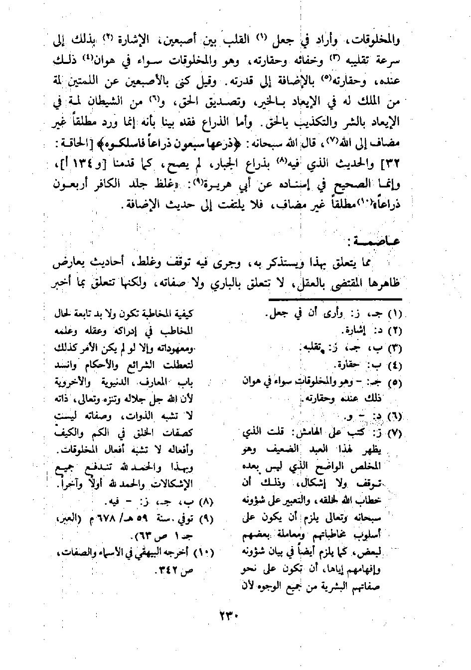 (¬7) ز: كتب على الهامش: قلت الذي يظهر لهذا العبد الضعيف وهو المخلص الواضح الذي ليس بعده توقف ولا إشكال، وذلك أن خطاب الله لخلقه، والتعبير على شؤونه سبحانه وتعالى يلزم أن يكون أسلوب مخاطباتهم ومعاماة بعضهم لبعض، كما يلزم أيضا في بيان شؤونه وإفهامهم إياها، أن تكون على نحو صفاتهم البشرية من جميع الوجوه لأن كيفية المخاطبة تكون ولا بد تابعة لحال المخاطب في إدراكه وعقله وعلمه ومعهوداته وإلا لو لم يكن الأمر كذلك لتعطلت الشرائع والأحكام وانسد باب المعارف الدذيوية والأخروية لأن الله جل جلاله وتنزه وتعالى، ذاته لا تشبه الذوات، وصفاته ليست كصفات الخلق في الكم والكيف وأفعاله لا تشبه أفعال المخلوقات. وبهذا والحمد لله تندفع جميع الإشكالات والحمد لله أولا وآخرا.