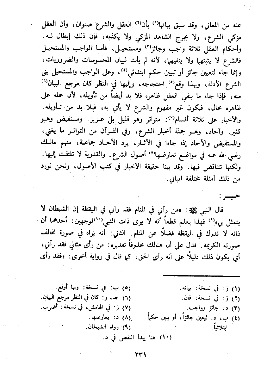 قال النبي - صلى الله عليه وسلم -: "من رآني في المنام فقد رآني في اليقظة إن الشيطان لا يتمثل بي" (¬9) فهذا يعلم قطعا أنه لا يرى ذات النبي (¬10) لوجهين: أحدهما أن ذاته لا تدرك في اليقظة فضلا عن المنام. الثاني: أنه يراه في صورة تخالف صورته الكريمة. فدل على أن هنالك محذوفا تقديره: من رأى مثالي فقد رآني، أي يكون ذلك دليلا على أنه رأى الحق، كما قال في رواية أخرى: "فقد رأى