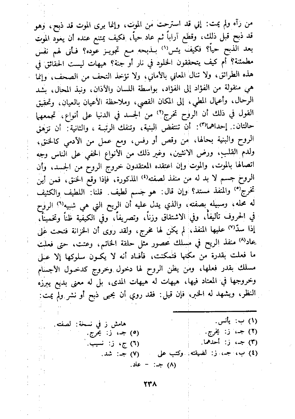 من رآه ولم يمت: إني قد استرحت من الموت، وإنما يرى الموت قد ذبح، وهو قد ذبح قبل ذلك، وقطع آرابا ثم عاد حيا، فكيف يمتنع عنده أن يعود الموت بعد الذبح حيا؟ فكيف يئس (¬1) بذبحه مع تجويز عوده؟ فأنى لهم نفس مطمئنة؟ أم كيف يتحققون الخلود في نار أو جنة؟ هيهات ليست الحقائق في هذه الطرائق، ولا تنال المعاني بالأماني، ولا تؤخذ التحف من الصحف، وإنما هي منقولة من الفؤاد إلى الفؤاد، بواسطة اللسان والآذان، ونبذ المحال، بشد الرحال، وأعمال المطي، إلى المكان القصي، وملاحظة الأعيان بالعيان، وتحقيق القول في ذلك أن الروح تخرج (¬2) من الجسد في الدنيا على أنواع، تجمعهما حالتان: إحداهما (¬3): أن تنتفض البنية، وتنفك الرتبة، والثانية: أن تزهق الروح والبنية بحالها، من وقص أو رفس، ومع عمل من الآدمي كالخنق، ولدم القلب، ورض الانثيين، وغير ذلك من الأنواع الخفي على الناس وجه اتصالها بالموت، والموت وإن اعتقده المعتقدون خروج الروح من الجسد، وأن الروح جسم لا بد له من منفذ لصفته (¬4) المذكورة، فإذا وقع الخنق، فمن أين تخرج (¬5) والمنفذ مستد؟ وإن قال: هو جسم لطيف. قلنا: اللطيف والكثيف له محله، وسبيله بصفته، والذي يدل عليه أن الريح التي هي شبيه (¬6) الروح في الحروف تأليفا، وفي الاشتقاق وزنا، وتصريفا، وفي الكيفية ظنا وتخمينا، إذا سد (¬7) عليها المنفذ، لم يكن لها مخرج، ولقد روى أن الخزانة فتحت على عاد (¬8) منفذ الريح في مسلك محصور مثل حلقة الخاتم، وعتت، حتى فعلت ما فعلت بقدرة من مكنها فتمكنت، فأفاد أنه لا يكون سلوكها إلا على مسلك بقدر فعلها، ومن يظن الروح لها دخول وخروج كدخول الأجسام وخروجها في المعتاد فيها، هيهات له هيهات المدى، بل له معنى بديع يبرزه النظر، ويشهد له الخبر، فإن قيل: فقد روي أن يحيى ذبح أو نشر ولم يمت:
