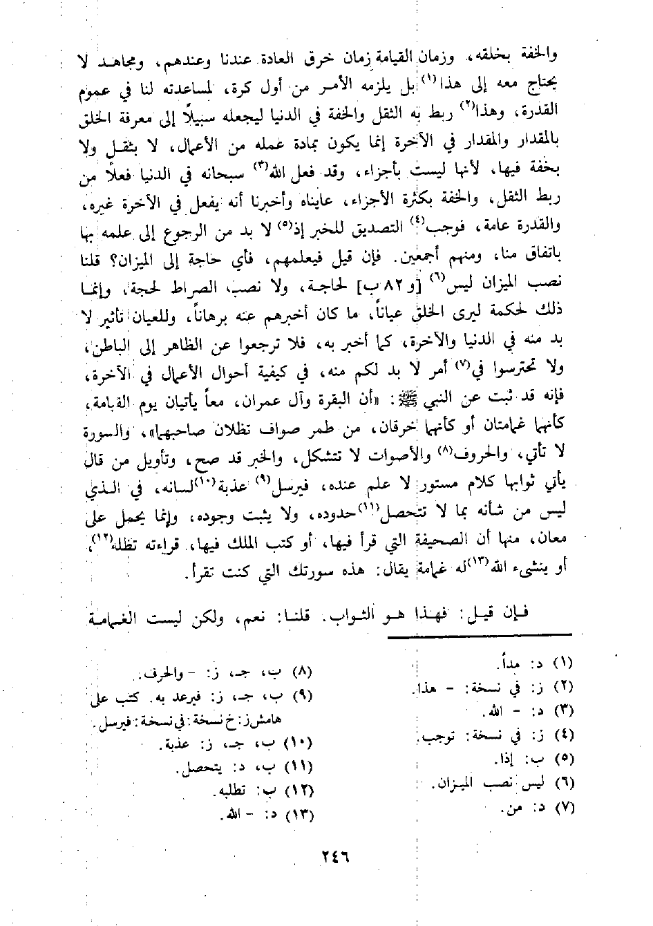 والخفة بخلقه، وزمان القيامة زمان خرق العادة عندنا وعندهم، ومجاهد لا يحتاج معه إلى هذا (¬1) بل يلزمه الأمر من أول كرة، لمساعدته لنا في عموم القدرة، وهذا (¬2) ربط به الثقل والخفة في الدنيا ليجعله سبيلا إلى معرفة الخلق بالمقدار والمقدار في الآخرة إنما يكون بمادة عمله من الأعمال، لا بنقل ولا بخفة فيها، لأنها ليست بأجزاء، وقد فعل الله (¬3) سبحانه في الدنيا فعلا من ربط الثقل، والخفة بكثرة الأجزاء، عايناه وأخبرنا أنه يفعل في الآخرة غيره، والقدرة عامة، فوجب (¬4) التصديق للخبر إذ (¬5) لا بد من الرجوع إلى علمه بها باتفاق منا، ومنهم أجمعين. فإن قيل فيعلمهم، فأي حاجة إلى الميزان؟ قلنا نصب الميزان ليس (¬6) [و 82 ب] لحاجة، ولا نصب الصراط لحجة، وإنما ذلك لحكمة ليرى الخلق عيانا، ما كان أخبرهم عنه برهانا، وللعيان تأثير لا بد منه في الدنيا والآخرة، كما أخبر به، فلا ترجعوا عن الظاهر إلى الباطن، ولا تحترسوا في (¬7) أمر لا بد لكم منه، في كيفية أحوال الأعمال في الآخرة، فإنه قد ثبت عن النبي - صلى الله عليه وسلم -: "أن البقرة وآل عمران، معا يأتيان يوم القيامة، كأنهما غمامتان أو كأنهما خرقان، من طمر صواف تظلان صاحبهم"، والسورة لا تأتي، والحروف (¬8) والأصوات لا تتشكل، والخبر قد صح، وتأويل من قال يأتي ثوابها كلام مستور لا علم عنده، فيرسل (¬9) عذبة (¬10) لسانه، في الذي ليس من شأنه بما لا تتحصل (¬11) حدوده، ولا يثبت وجوده، وأنما يحمل على معان، منها أن الصحيفة التي قرأ فيها، أو كتب الملك فيها، قراءته تظله (¬12)، أو ينشئ الله (¬13) له غمامة يقال: هذه سورتك التي كنت تقرأ.
