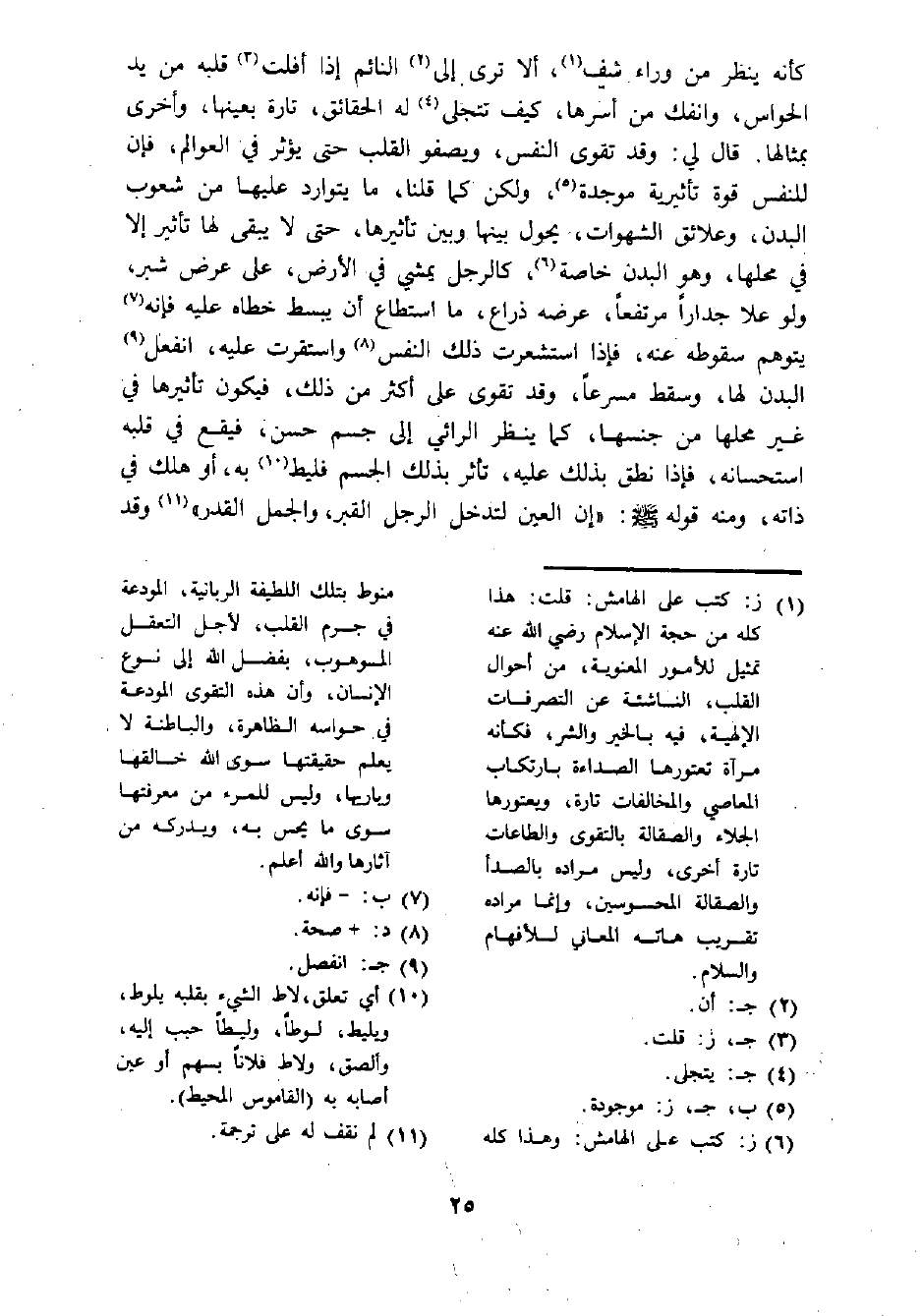 (¬6)، ز: كتب على الهامش: وهذا كله منوط بتلك اللطيفة الربانية، المودعة في جرم القلب، لأجل التعقل الموهوب، بفضل الله إلى نوع الإنسان، وأن هذه التقوى المودعة في حواسه الظاهرة، والباطنة لا يعلم حقيقتها سوى الله خالقها وباريها، وليس للمرء من معرفتها سوى ما يحس به، ويدركه من آثارها والله أعلم.