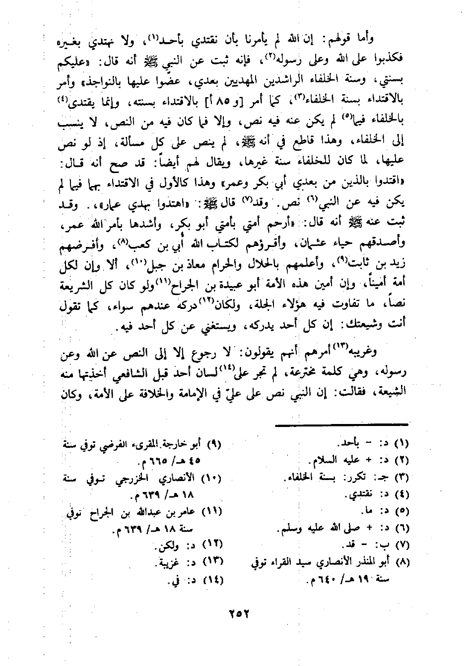 وأما قولهم: إن الله لم يأمرنا بأن نقتدي بأحد (¬1)، ولا نهتدي بغيره فكذبوا على الله وعلى رسوله (¬2)، فإنه ثبت عن النبي - صلى الله عليه وسلم - أنه قال: "عليكم بسنتي، وسنة الخلفاء الراشدين المهديين بعدي، عضوا عليها بالنواجذ" وأمر بالاقتداء بسنة الخلفاء (¬3)، كما أمر [و 85 أ]، بالاقتداء بسنته، وإنما يقتدى (¬4) بالخلفاء فيما (¬5) لم يكن عنه فيه نص، والا فما كان فيه من النص، لا ينسب إلى الخلفاء، وهذا قاطع في أنه - صلى الله عليه وسلم -، لم ينص على كل مسألة، إذ لو نص عليها، لما كان للخلفاء سنة غيرها، ويقال لهم أيضا: قد صح أنه قال: "اقتدوا بالذين من بعدي أبي بكر وعمر" وهذا كالأول في الاقتداء بهما فيما لم يكن فيه عن النبي (¬6) نص. وقد (¬7) قال - صلى الله عليه وسلم -: "اهتدوا بهدي عما"،. وقد ثبت عنه - صلى الله عليه وسلم - أنه قال: "أرحم أمتي بأمتي أبو بكر، وأشدها بأمر الله عمر، وأصدقهم حياء عثمان، وأقرؤهم لكتاب الله أبي بن كعب (¬8)، وأفرضهم زيد بن ثابت (¬9)، وأعلمهم بالحلال والحرام معاذ بن جبل (¬10)، ألا وإن لكل أمة أمينا، وإن أمين هذه الأمة أبو عبيدة بن الجراح (¬11) ولو كان كل الشريعة نصا، ما تفاوت فيه هؤلاء الجلة، ولكان (¬12) دركه عندهم سواء، كما تقول أنت وشيعتك: إن كل أحد يدركه، ويستغني عن كل أحد فيه.