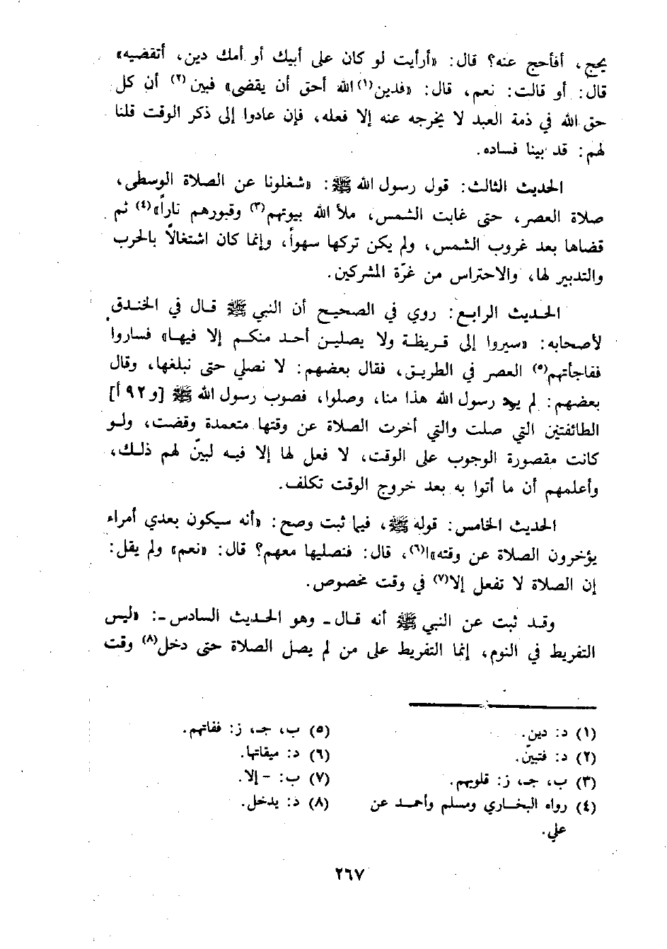 الحديث الثالث: قول رسول الله - صلى الله عليه وسلم -: "شغلونا عن الصلاة الوسطى، صلاة العصر، حتى غابت الشمس، ملأ الله بيوتهم (¬3) وقبورهم نارا" (¬4) ثم قضاها بعد غروب الشمس، ولم يكن تركها سهوا، وإنما كان اشتغالا بالحرب والتدبير لها، والاحتراس من غرة المشركين.