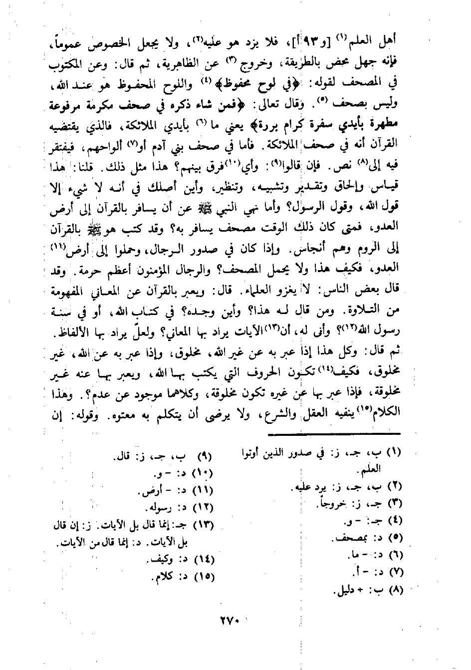 أهل العلم (¬1) [و 93 أ]، فلا يزد هو عليه (¬2)، ولا يجعل الخصوص عموما، فإنه جهل محض بالطريقة، وخروج (¬3) عن الظاهرية، ثم قال: وعن المكتوب في المصحف لقوله: {في لوح محفوظ} (¬4) واللوح المحفوظ هو عند الله، وليس بصحف (¬5). وقال تعالى: {فمن شاء ذكره في صحف مكرمة مرفوعة مطهرة بأيدي سفرة كرام بررة} يعني ما (¬6) بأيدي الملائكة، فالذي يقتضيه القرآن أنه في صحف الملائكة. فأما في صحف بني آدم أو (¬7) ألواحهم، فيفتقر فيه إلى (¬8) نص. فإن قالوا (¬9): وأي (¬10) فرق بينهم؟ هذا مثل ذلك. قلنا: هذا قياس وإلحاق وتقدير وتشبيه، وتنظير، وأين أصلك في أنه لا شيء إلا قول الله، وقول الرسول؟ وأما نهي النبي - صلى الله عليه وسلم - عن أن يسافر بالقرآن إلى أرض العدو، فمتى كان ذلك الوقت مصحف يسافر به؟ وقد كتب هو - صلى الله عليه وسلم - بالقرآن إلى الروم وهم أنجاس. وإذا كان في صدور الرجال، وحملوا إلى أرض (¬11) العدو، فكيف هذا ولا يحمل المصحف؟ والرجال المؤمنون أعظم حرمة. وقد قال بعض الناس: لا يغزو العلماء. قال: ويعبر بالقرآن عن المعاني المفهومة من التلاوة. ومن قال له هذا؟ وأين وجده؟ في كتاب الله، أو في سنة رسول الله (¬12)؟ وأنى له، أن (¬13) الآيات يراد بها المعاني؟ ولعل يراد بها الألفاظ. ثم قال: وكل هذا إذا عبر به عن غير الله، مخلوق، وإذا عبر به عن الله، غير مخلوق، فكيف (¬14) تكون الحروف التي يكتب بها الله، ويعبر بها عنه غير مخلوقة، فإذا عبر بها عن غيره تكون مخلوقة، وكلاهما موجود عن عدم؟. وهذا الكلام (¬15) ينفيه العقل والشرع، ولا يرضى أن يتكلم به معتوه. وقوله: إن