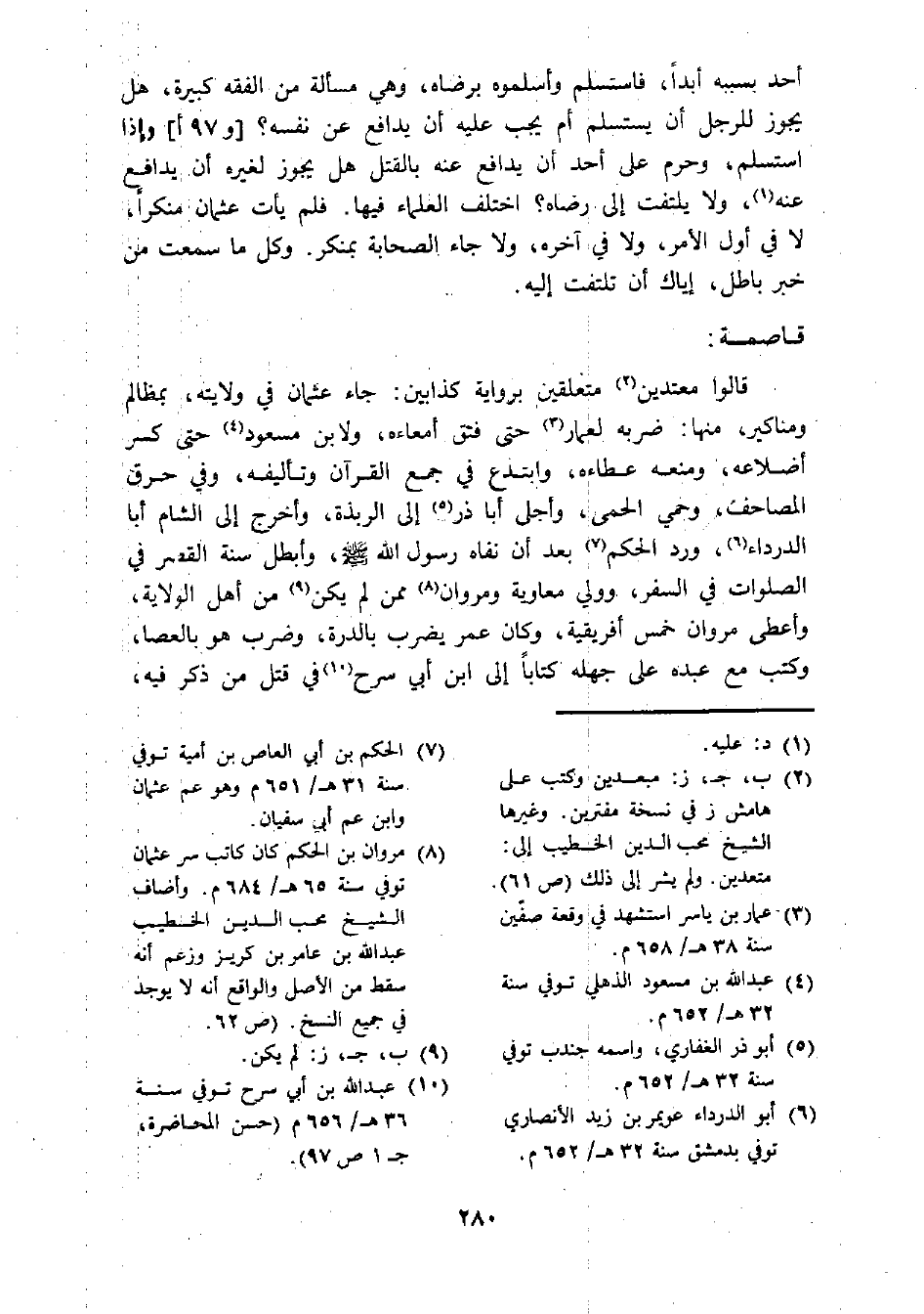 (¬8) مروان بن الحكم كان كاتب سر عثمان توفي سنة 65 هـ/ 684 م. وأضاف الشيخ محب الدين الخطيب عبد الله بن عامر بن كريز وزعم أنه سقط من الأصل والواقع أنه لا يوجد في جميع النسخ. (ص 62).