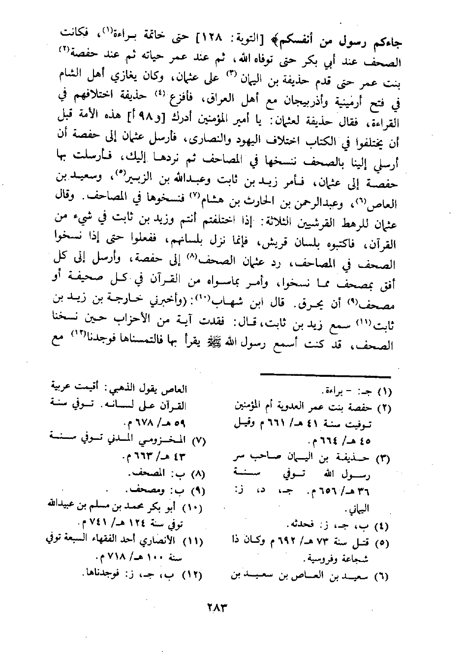جاءكم رسول من أنفسكم} [التوبة: 128] حتى خاتمة براءة (¬1)، فكانت الصحف عند أبي بكر حتى توفاه الله، ثم عند عمر حياته ثم عند حفصة (¬2) بنت عمر حتى قدم حذيفة بن اليمان (¬3) على عثمان، وكان يغازي أهل الشام في فتح أرمينية وأذربيجان مع أهل العراق، فأفزع (¬4) حذيفة اختلافهم في القراءة، فقال حذيفة لعثمان: يا أمير المؤمنين أدرك [و 98 أ] هذه الأمة قبل أن يختلفوا في الكتاب اختلاف اليهود والنصارى، فأرسل عثمان إلى حفصه أن أرسلي إلينا بالصحف ننسخها في المصاحف ثم نردها إليك، فأرسلت بها حفصة إلى عثمان، فأمر زيد بن ثابت وعبد الله بن الزبير (¬5)، وسعيد بن العاص (¬6)، وعبد الرحمن بن الحارث بن هشام (¬7) فنسخوها في المصاحف. وقال عثمان للرهط القرشيين الثلاثة: إذا اختلفتم أنتم وزيد بن ثابت في شيء من القرآن، فاكتبوه بلسان قريش، فإنما نزل بلسانهم، ففعلوا حتى إذا نسخوا الصحف في المصاحف، رد عثمان الصحف (¬8) إلى حفصة، وأرسل إلى كل أفق بمصحف مما نسخوا، وأمر بما سواه من القرآن في كل صحيفة أو مصحف (¬9) أن يحرق. قال ابن شهاب (¬10): (وأخبرني خارجة بن زيد بن ثابت (¬11) سمع زيد بن ثابت، قال: فقدت آية من الأحزاب حين نسخنا الصحف، قد كنت أسمع رسول الله - صلى الله عليه وسلم - يقرأ بها فالتمسناها فوجدنا (¬12) مع
