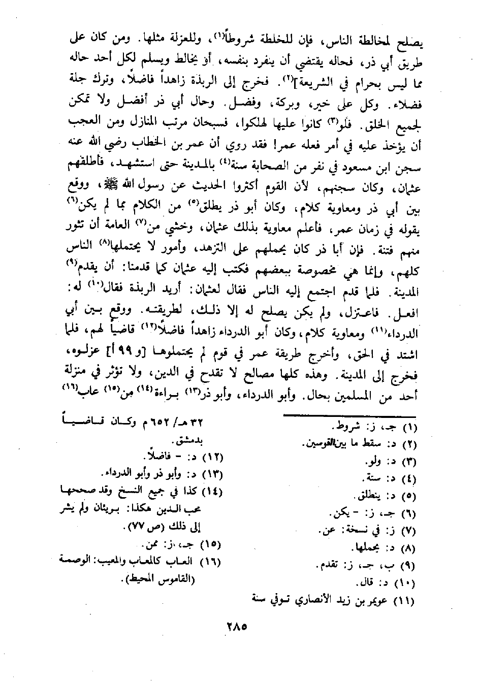 يصلح لمخالطة الناس، فإن للخلطة شروطا (¬1)، وللعزلة مثلها. ومن كان على طريق أبي ذر، فحاله يقتضى أن ينفرد بنفسه، أو يخالط ويسلم لكل أحد حاله مما ليس بحرام في الشريعة] (¬2). فخرج إلى الربذة زاهدا فاضلا، وترك جلة فضلاء. وكل على خير، وبركة، وفضل. وحال أبي ذر أفضل ولا تمكن لجميع الخلق. فلو (¬3) كانوا عليها لهلكوا، فسبحان مرتب المنازل ومن العجب أن يؤخذ عليه في أمر فعله عمر! فقد روي أن عمر بن الخطاب رضي الله عنه سجن ابن مسعود في نفر من الصحابة سنة (¬4) بالمدينة حتى استشهد، فأطلقهم عثمان، وكان سجنهم، لأن القوم أكثروا الحديث عن رسول الله - صلى الله عليه وسلم -، ووقع بين أبي ذر ومعاويه كلام، وكان أبو ذر يطلق (¬5) من الكلام بما لم يكن (¬6) يقوله في زمان عمر، فأعلم معاوية بذلك عثمان، وخشي من (¬7) العامة أن تثور منهم فتنة. فإن أبا ذر كان يحملهم على التزهد، وأمور لا يحتملها (¬8) الناس كلهم، وإنما هي مخصوصة ببعضهم فكتب إليه عثمان كما قدمنا: أن يقدم (¬9) المدينة. فلما قدم اجتمع إليه الناس فقال لعثمان: أريد الربذة فقال (¬10) له: افعل. فاعتزل، ولم يكن يصلح له إلا ذلك؛ لطريقته. ووقع بين أبي الدرداء (¬11)؛ ومعاويه كلام، وكان أبو الدرداء زاهدا فاضلا (¬12) قاضيا لهم، فلما اشتد في الحق، وأخرج طريقة عمر في قوم لم يحتملوها [و 99 أ] عزلوه، فخرج إلى المدينة. وهذه كلها مصالح لا تقدح في الدين، ولا تؤثر في منزلة أحد من المسلمين بحال. وأبو الدرداء، وأبو ذر (¬13) براءة (¬14) من (¬15) عاب (¬16)