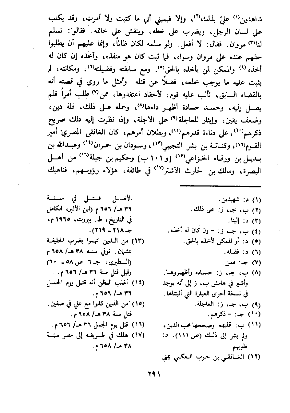 شاهدين (¬1) علي بذلك (¬2)، وإلا فيميني أني ما كتبت ولا أمرت، وقد يكتب على لسان الرجل، ويضرب على خطه، وينقش على خاتمه. فقالوا: تسلم لنا (¬3) مروان. فقال: لا أفعل. ولو سلمه لكان ظالما، وإنما عليهم أن يطلبوا حقهم عنده على مروان وسواه، فما ثبت كان هو منفذه، وآخذه إن كان له أخذه (¬4) والممكن لمن يأخذه بالحق (¬5). ومع سابقته وفضيلته (¬6)، ومكانته، لم يثبت عليه ما يوجب خلعه، فضلا عن قتله. وأمثل ما روى في قصته أنه بالقضاء السابق، تألب عليه قوم، لأحقاد اعتقدوها، ممن (¬7) طلب أمرا فلم يصل إليه، وحسد حسادة أظهر داءها (¬8)، وحمله على ذلك، قلة دين، وضعف يقين، وإيثار للعاجلة (¬9) على الآحلة، وإذا نظرت إليه دلك صريح ذكرهم (¬10)،على دناءة قدرهم (¬11) وبطلان أمرهم، كان الغافقي المصري أمر القوم (¬12)، وكنانة بن بشر التجيبي (¬13)، وسودان بن حمران (¬14) وعبد الله بن بديل بن ورقاء الخزاعي (¬15)، [و101 ب] وحكيم بن جبلة (¬16) من أهل البصرة، ومالك بن الحارث الأشتر (¬17)، في طائفة، هؤلاء رؤوسهم، فناهيك