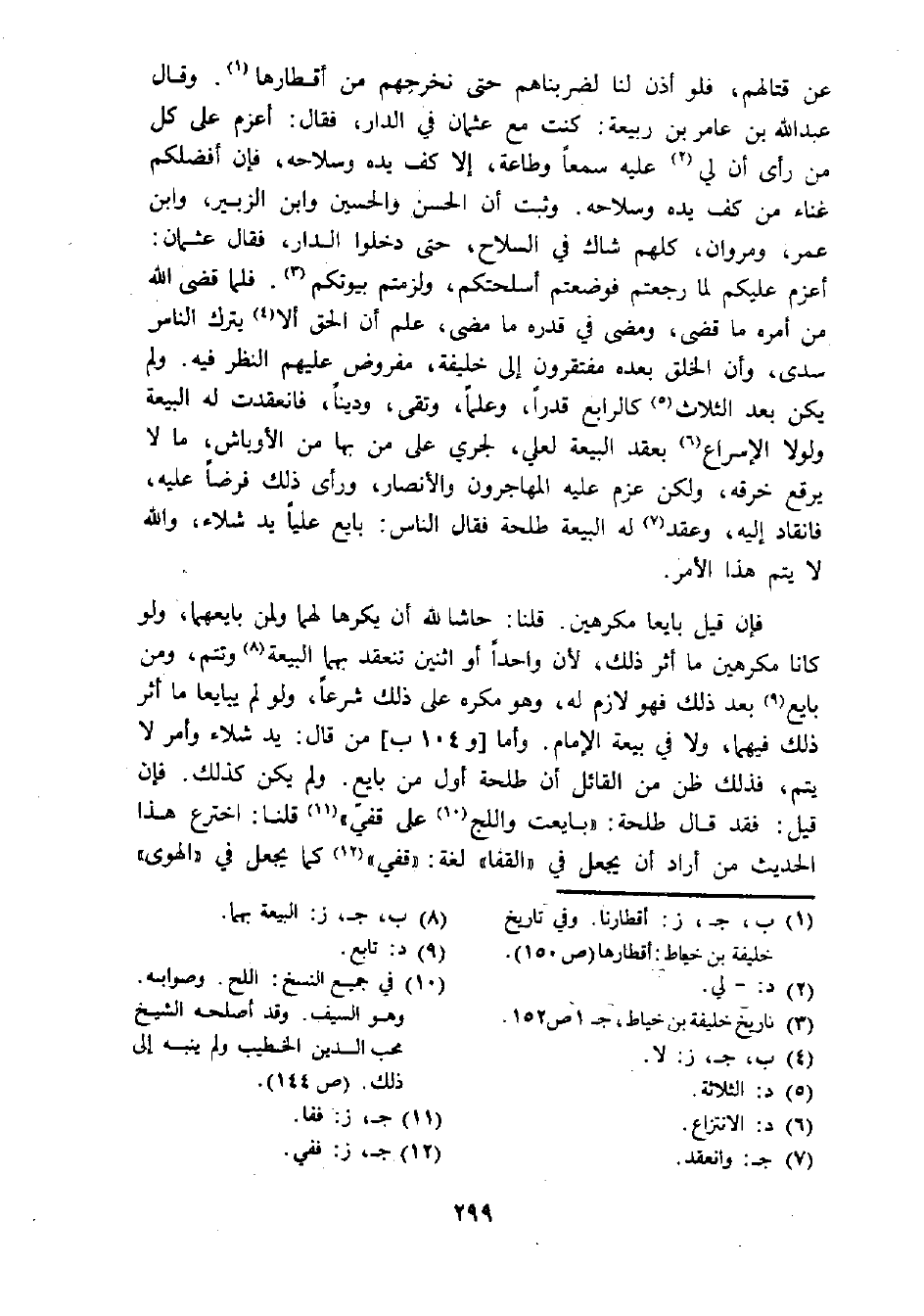 فإن قيل بايعا مكرهين. قلنا: حاشا لله أن يكرها لهما ولمن بايعهما، ولو كانا مكرهين ما أثر ذلك، لأن واحدا أو اثنين تنعقد بهما البيعة (¬8) وتتم، ومن بايع (¬9) بعد ذلك فهو لازم له، وهو مكره على ذلك شرعا، ولو لم يبايعا ما أثر ذلك فيهما، ولا في بيعة الإمام. وأما [و 104 ب] من قال: يد شلاء وأمر لا يتم، فذلك ظن من القائل أن طلحة أول من بايع. ولم يكن كذلك. فإن قيل: فقد قال طلحة: "بايعت واللج (¬10) على قفي" (¬11) قلنا: اخترع هذا الحديث من أراد أن يجعل في "القفا" لغة: "قفي" (¬12) كما يجعل في "الهوى"