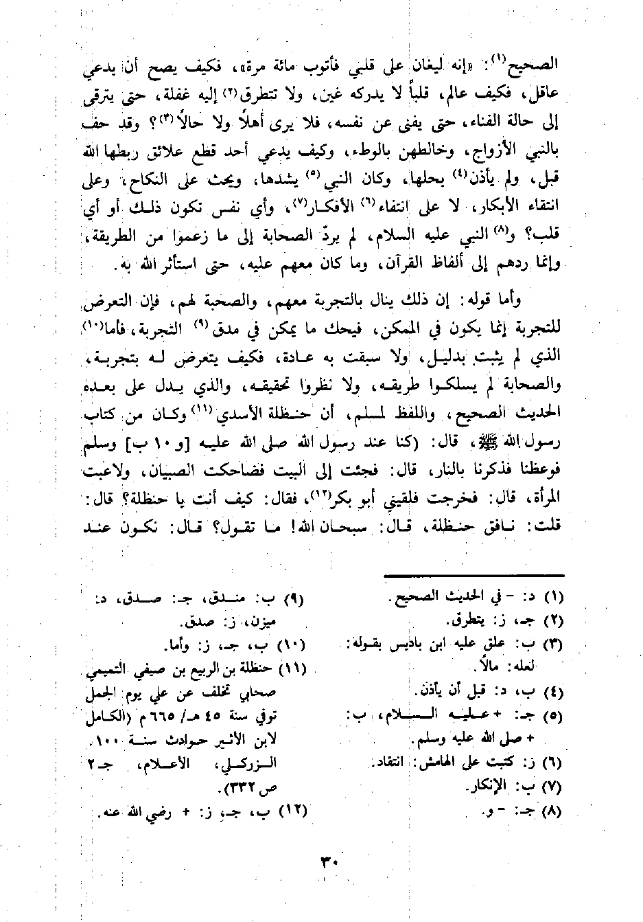 وأما قوله: إن ذلك ينال بالتجربة معهم، والصحبة لهم، فإن التعرض للتجربة إنما يكون في الممكن، فيحك ما يمكن في مدق (¬9) التجربة، فأما (¬10) الذي لم يثبت بدليل، ولا سبقت به عادة، فكيف يتعرض له بتجربة، والصحابة لم يسلكوا طريقه، ولا نظروا تحقيقه، والذي يدل على بعده الحديث الصحيح، واللفظ لمسلم، أن حنظلة الأسدي (¬11) وكان من كتاب رسول الله - صلى الله عليه وسلم -، قال: (كنا عند رسول الله صلى الله عليه [و 10 ب] وسلم فوعظنا فذكرنا بالنار، قال: فجئت إلى البيت فضاحكت الصبيان، ولاعبت المرأة، قال: فخرجت فلقينى أبو بكر (¬12)، فقال: كيف أنت يا حنظلة؟ قال: قلت: نافق حنظلة، قال: سبحان الله! ما تقول؟ قال: نكون عند