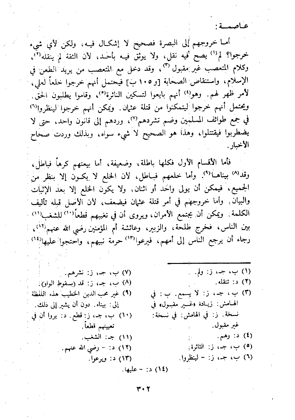 أما خروجهم إلى البصرة فصحيح لا إشكال فيه، ولكن لأي شيء خرجوا؟ لم (¬1) يصح فيه نقل، ولا يوثق فيه بأحد، لأن الثقة لم ينقله (¬2)، وكلام المتعصب غير مقبول (¬3)، وقد دخل مع المتعصب من يريد الطعن في الإسلام، واستنفاص الصحابة [و 105 ب] فيحتمل أنهم خرجوا خلعا لعلي، لأمر ظهر لهم. وهو (¬4) أنهم بايعوا لتسكين النائرة (¬5)، وقاموا يطلبون الحق. ويحتمل أنهم خرجوا ليتمكنوا من قتلة عثمان. ويمكن أنهم خرجوا لينظروا (¬6) في جمع طوائف المسلمين وضم تشردهم (¬7)، وردهم إلى قانون واحد، حتى لا يضطربوا فيقتتلوا، وهذا هو الصحيح لا شيء سواه، وبذلك وردت صحاح الأخبار.