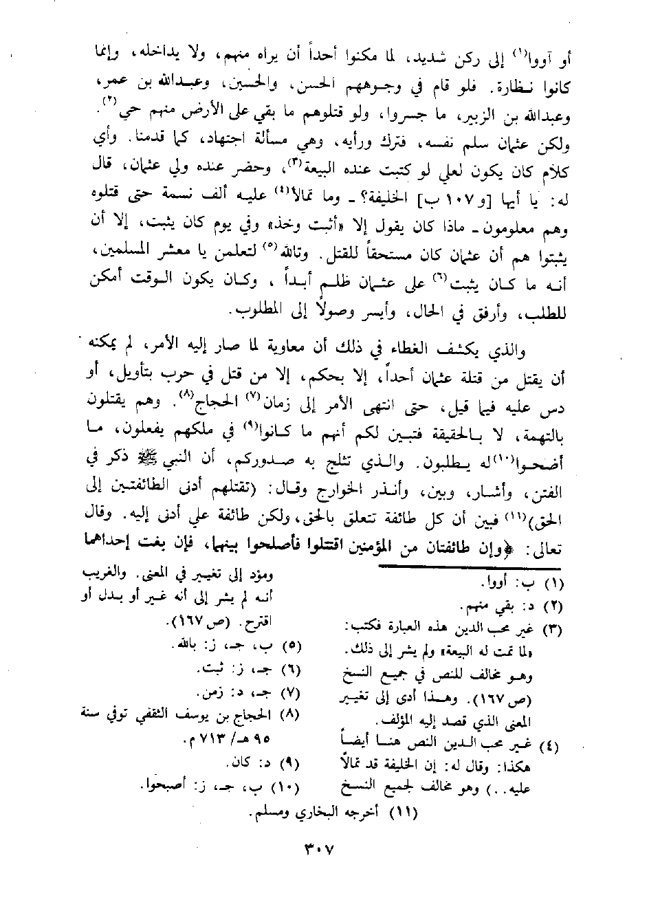 والذي يكشف الغطاء في ذلك أن معاوية لما صار إليه الأمر، لم يمكنه أن يقتل من قتلة عثمان أحدا، إلا بحكم، إلا من قتل في حرب بتأويل، أو دس عليه فيما قيل، حتى انتهى الأمر إلى زمان (¬7) الحجاج (¬8). وهم يقتلون بالتهمة، لا بالحقيقة فتبين لكم أنهم ما كانوا (¬9) في ملكهم يفعلون، ما أضحوا (¬10) له يطلبون. والذي تثلج به صدوركم، أن النبي - صلى الله عليه وسلم - ذكر في الفتن، وأشار، وبين، وأنذر الخوارج وقال: (تقتلهم أدنى الطائفتين إلى الحق) (¬11) فبين أن كل طائفة تتعلق بالحق، ولكن طائفة علي أدنى إليه. وقال تعالى: {وإن طائفتان من المؤمنين اقتتلوا فأصلحوا بينهما، فإن بغت إحداهما