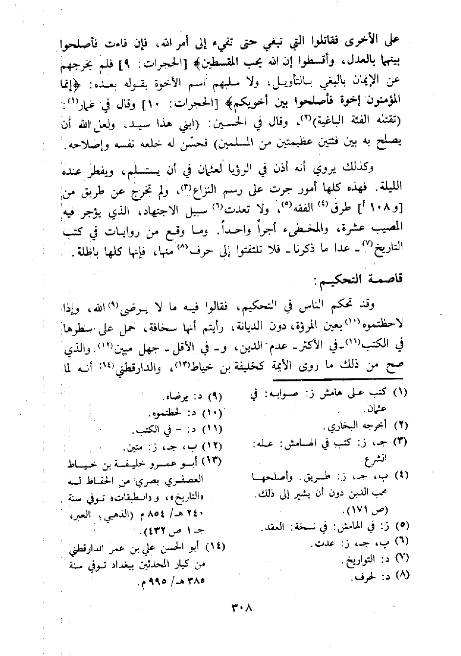 وقد تحكم الناس في التحكيم، فقالوا فيه ما لا يرضى (¬9) الله، وإذا لاحظتموه (¬10) بعين المرؤة، دون الديانة، رأيتم أنها سخافة، حمل على سطرها في الكتب (¬11) - في الأكثر - عدم الدين، و - في الأقل - جهل مبين (¬12). والذي صح من ذلك ما روى الأيمة كخليفة بن خياط (¬13)، والدارقطني (¬14) أنه لما
