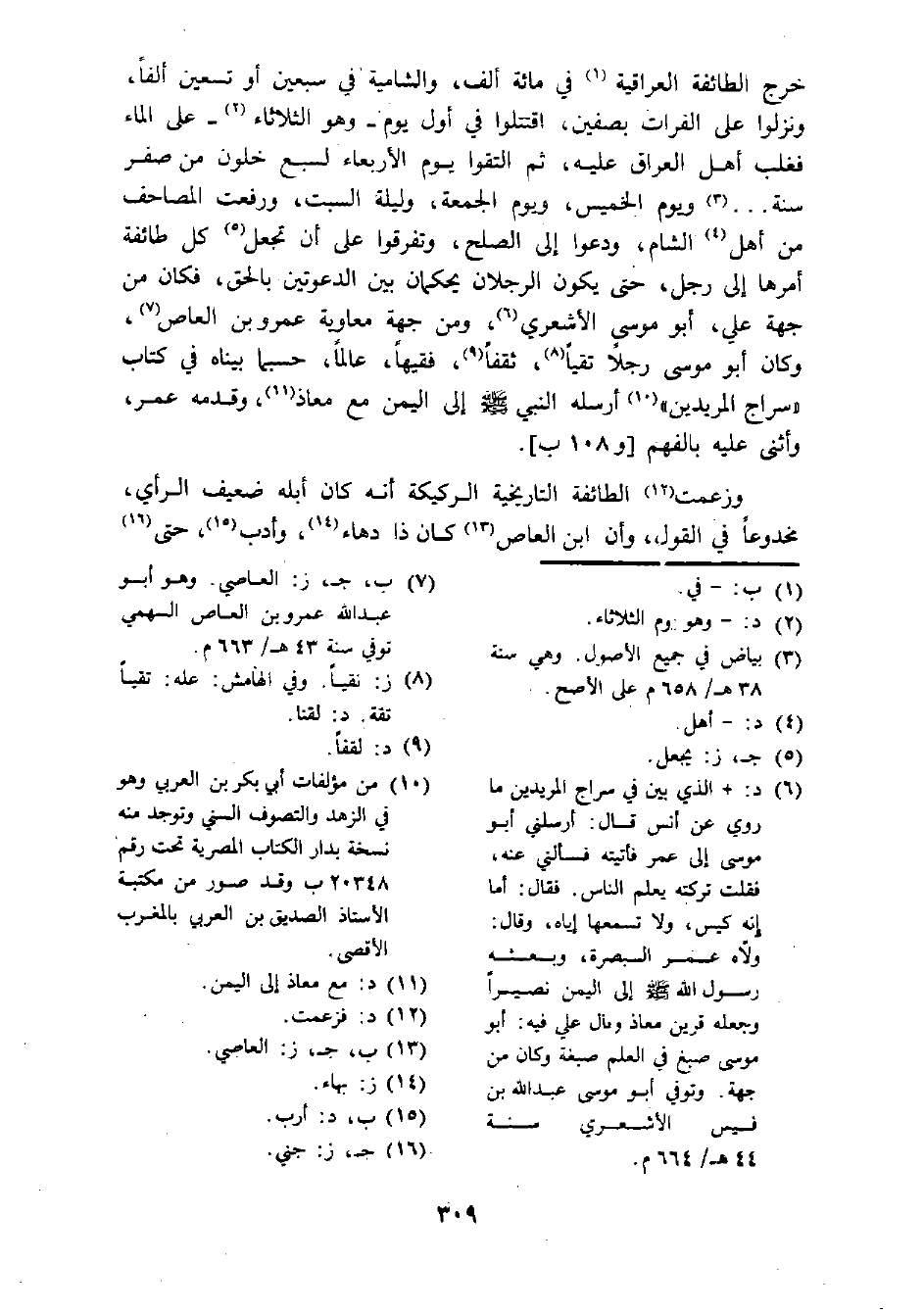 (¬6) د: + الذي بين في سراح المريدين ما روي عن أنس قال: أرسلي أبو موسى إلى عمر فأتيته فسألني عنه، فقلت تركته يعلم الناس. فقال: أما أنه كيس، ولا تسمعها إياه، وقال: ولاه عمر البصرة، وبعثه رسول الله. إلى اليمن نصيرا وجعله قرين معاذ وقال علي فيه: أبو موسى صبغ في العلم صبغة وكان من جهة. وتوفي، أبو موسى عبد الله بن قيس الأشعري سنة 44هـ/ 664م.
