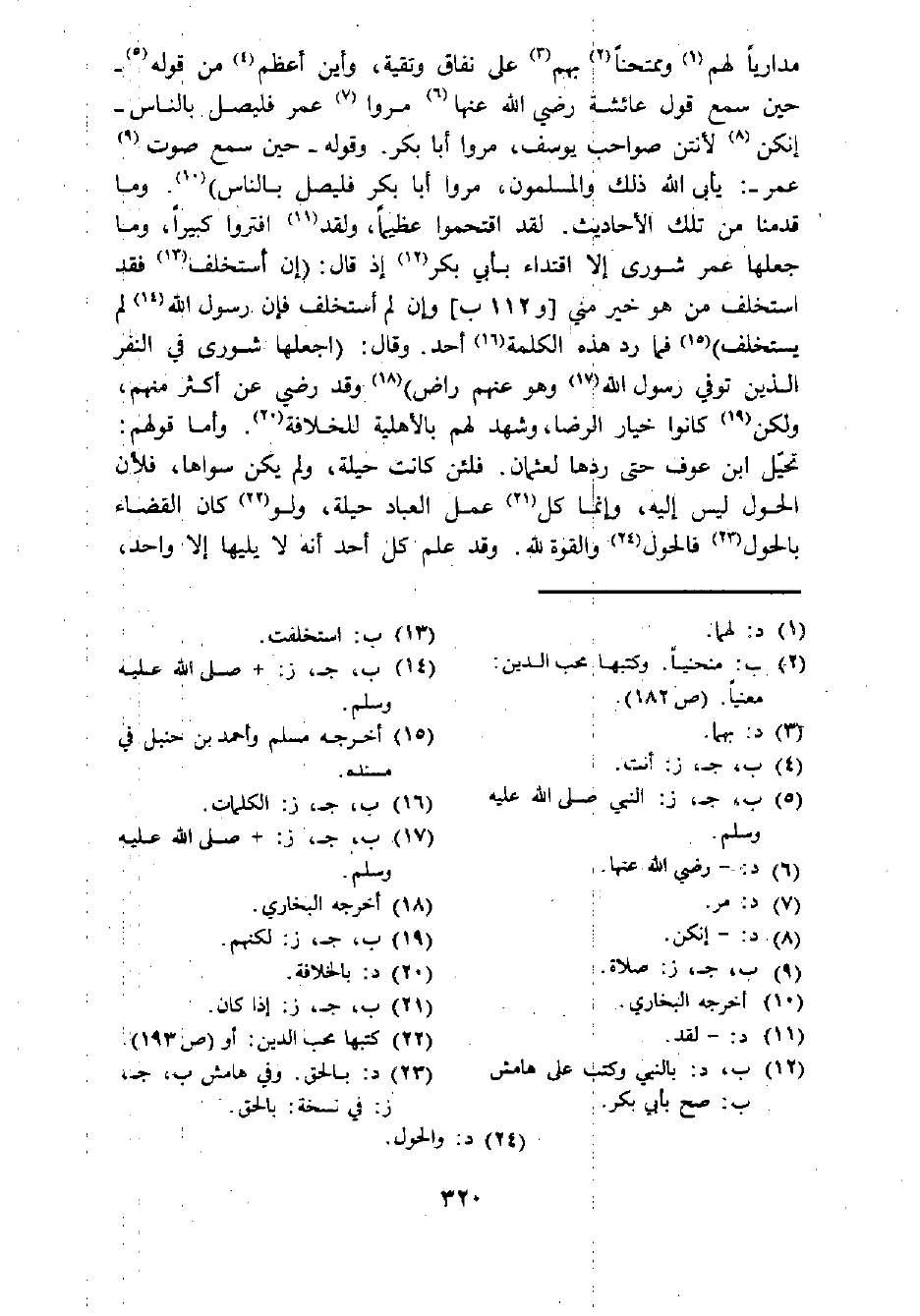 مداريا لهم (¬1) وممتحنا (¬2) بهم (¬3) على نفاق وتقية، وأين أعظم (¬4) من قوله (¬5) - حين سمع قول عائشة رضي الله عنها (¬6) مروا (¬7) عمر فليصل بالناس - إنكن (¬8) لأنتن صواحب يوسف، مروا أبا بكر. وقوله - حين سمع صوت (¬9) عمر -: يأبى الله ذلك والمسلمون، مروا أبا بكر فليصل بالناس) (¬10). وما قدمنا من تلك الأحاديث. لقد اقتحموا عظيما، ولقد (¬11) افتروا كبيرا: وما جعلها عمر شورى إلا اقتداء بأبي بكر (¬12) إذ قال: (إن استخلف (¬13) فقد استخلف من هو خير مني [و 112 ب] وإن لم أستخلف فإن رسول الله (¬14) لم يستخلف) (¬15) فما رد هذه الكلمة (¬16) أحد. وقال: (اجعلها شورى في النفر الذين توفي رسول الله (¬17) وهو عنهم راض) (¬18) وقد رضي عن أكثر منهم، ولكن (¬19) كانوا خيار الرضا، وشهد لهم بالأهلية للخلافة (¬20). وأما قولهم: تحيل ابن عوف حتى ردها لعثمان. فلئن كانت حيلة، ولم يكن سواها، فلأن الحول ليس إليه، وإنما كل (¬21) عمل العباد حيلة، ولو (¬22) كان القضاء بالحول (¬23) فالحول (¬24) والقوة لله. وقد علم كل أحد أنه لا يليها إلا واحد،