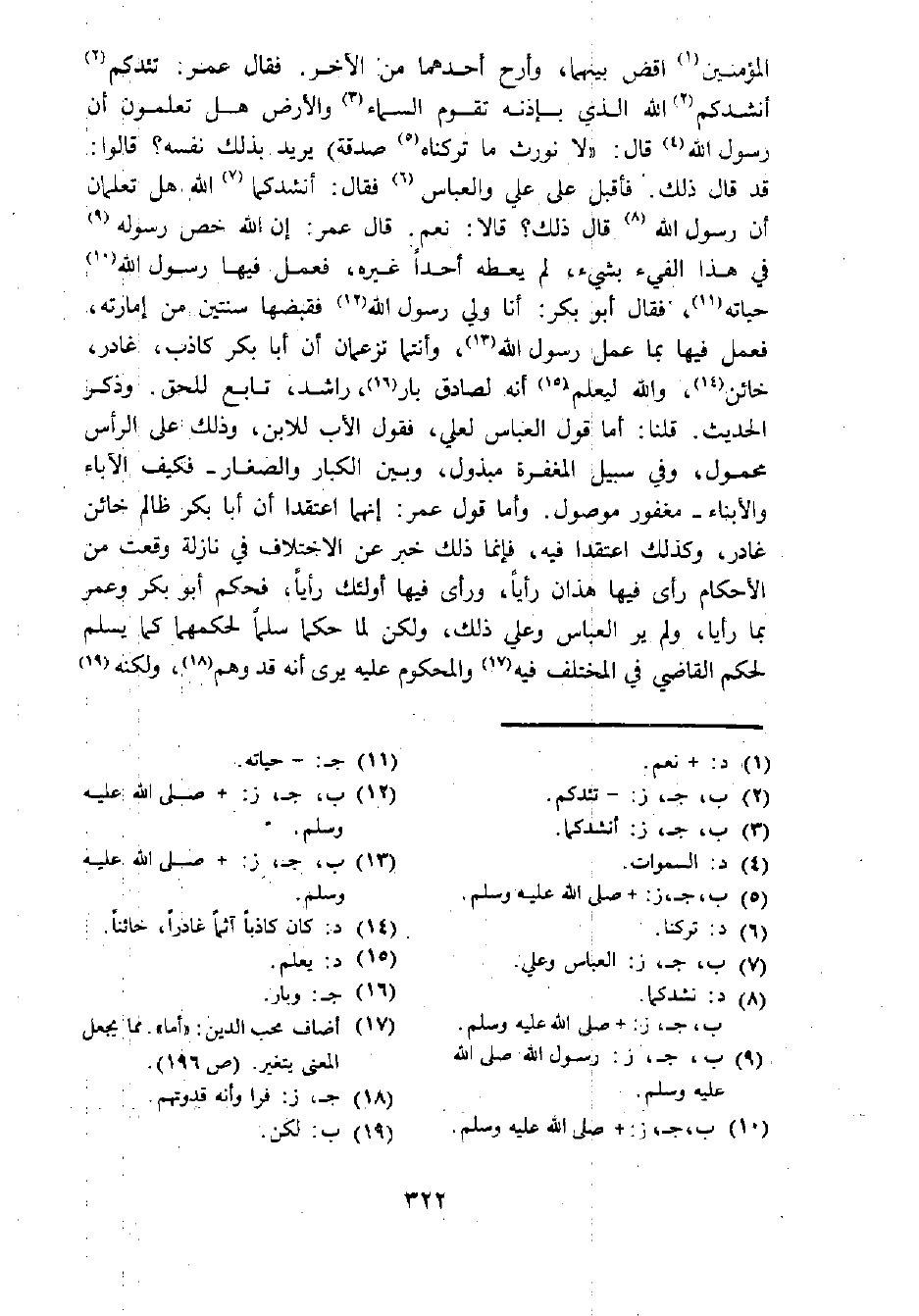 المؤمنين (¬1) اقض بينهما، وأرح أحدهما من الآخر. فقال عمر: تئدكم (¬2) أنشدكم (2) الله الذي بإذنه تقوم السماء (¬3) والأرض هل تعلمون أن رسول الله (¬4) قال: "لا نورث ما تركناه (¬5) صدقة" يريد بذلك نفسه؟ قالوا: قد قال ذلك. فأقبل على علي والعباس (¬6) فقال: أنشدكما (¬7) الله هل تعلمان أن رسول الله (¬8) قال ذلك؟ قالا: نعم. قال عمر: إن الله خص رسوله (¬9) في هذا الفيء بشيء، لم يعطه أحدا غيره، فعمل فيها رسول الله (¬10) حياته (¬11)، فقال أبو بكر: أنا ولي رسول الله (¬12) فقبضها سنتين من إمارته، فعمل فيها بما عمل رسول الله (¬13)، وأنتما تزعمان أن أبا بكر كاذب، غادر، خائن (¬14)، والله ليعلم (¬15) أنه لصادق بار (¬16)، راشد، تابع للحق. وذكر الحديث. قلنا: أما قول العباس لعلي، فقول الأب للابن، وذلك على الرأس محمول، وفي سبيل المغفرة مبذول، وبين الكبار والصغار - فكيف الآباء والأبناء - مغفور موصول. وأما قول عمر: إنهما اعتقدا أن أبا بكر ظالم خائن غادر، وكذلك اعتقدا فيه، فإنما ذلك خبر عن الاختلاف في نازلة وقعت من الأحكام رأى فيها هذان رأيا، ورأى فيها أولئك رأيا، فحكم أبو بكر وعمر بما رأيا، ولم ير العباس وعلي ذلك، ولكن لما حكما سلما لحكمهما كما يسلم لحكم القاضي في المختلف فيه (¬17) والمحكوم عليه يرى أنه قد وهم (¬18)، ولكنه (¬19)
