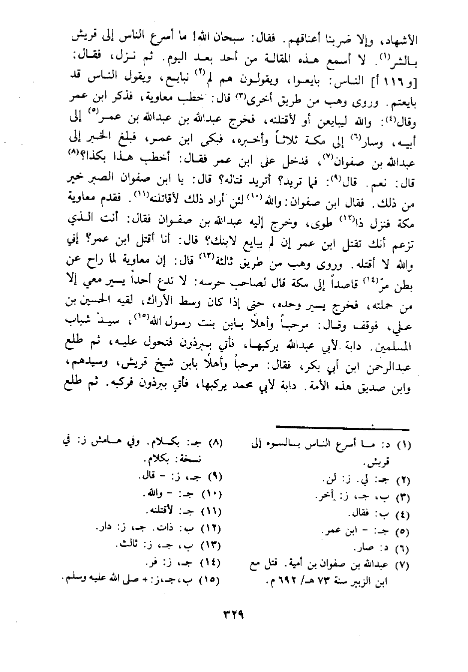 الأشهاد، وإلا ضربنا أعناقهم. فقال: سبحان الله! ما أسرع الناس إلى قريش بالشر (¬1). لا أسمع هذه المقالة من أحد بعد اليوم. ثم نزل، فقال: [و 116 أ]، الناس: بايعوا، ويقولون هم لم (¬2) نبايع، ويقول الناس قد بايعتم. وروى وهب من طريق أخرى (¬3) قال: خطب معاوية، فذكر ابن عمر وقال (¬4): والله ليبايعن أو لأقتلنه، فخرج عبد الله بن عبد الله بن عمر (¬5) إلى أبيه، وسار (¬6) إلى مكة ثلاثا وأخبره، فبكى ابن عمر، فبلغ الخبر إلى عبد الله بن صفوان (¬7)، فدخل على ابن عمر فقال: أخطب هذا بكذا؟ (¬8) قال: نعم. قال (¬9): فما تريد؟ أتريد قتاله؟ قال: يا ابن صفوان الصبر خير من ذلك. فقال ابن صفوان: والله (¬10) لئن أراد ذلك لأقاتلنه (¬11). فقدم معاوية مكة فنزل ذا (¬12) طوى، وخرج إليه عبد الله بن صفوان فقال: أنت الذي تزعم أنك تقتل ابن عمر إن لم يبايع لابنك؟ قال: أنا أقتل ابن عمر؟ إني والله لا أقتله. وروى وهب من طريق ثالثة (¬13) قال: إن معاوية لما راح عن بطن مر (¬14) قاصدا إلى مكة قال لصاحب حرسه: لا تدع أحدا يسير معي إلا من حملته، فخرج يسير وحده، حتى إذا كان وسط الأراك، لقيه الحسن بن علي، فوقف وقال: مرحبا وأهلا بابن بنت رسول الله (¬15)، سيد شباب المسلمين. دابة لأبي عبد الله يركبها، فأتي ببرذون فتحول عليه، ثم طلع عبد الرحمن ابن أبي بكر، فقال: مرحبا وأهلا بابن شيخ قريش، وسيدهم، وابن صديق هذه الأمة. دابة لأبي محمد يركبها، فأتي ببرذون فركبه. ثم طلع