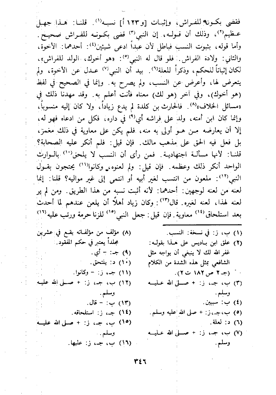 فقضى بكون للفراش، وإثبات [و 123 أ] نسبه (¬1). قلنا: هذا جهل عظيم (¬2)، وذلك أن قوله، إن النبي (¬3) قضى بكونه للفراش صحيح. وأما قوله، بثبوت النسب فباطل لأن عبدا ادعى شيئين (¬4): أحدهما: الأخوة، والثاني: ولادة الفراش. فلو قال له النبي (¬5): "هو أخوك، الولد للفراش"، لكان إثباتا للحكم، وذكرا للعلة (¬6). بيد أن النبي (¬7) عدل عن الأخوة، ولم يتعرض لها، وأعرض عن النسب، ولم يصرح به. وإنما في الصحيح في لفظ (هو أخوك)، وفي آخر (هو لك) معناه فأنت أعلم به. وقد مهدنا ذلك في "مسائل الخلاف" (¬8). فالحارث بن كلدة لم يدع زيادا، ولا كان إليه منسوبا، وإنما كان ابن أمته، ولد على فراشه أي (¬9) في داره، فكل من ادعاه فهو له، إلا أن يعارضه من هو أولى به منه، فلم يكن على معاوية في ذلك مغمز، بل فعل فيه الحق على مذهب مالك. فإن قيل: فلم أنكر عليه الصحابة؟ قلنا: لأنها مسألة اجتهادية. فمن رأى أن النسب لا يلحق (¬10) بالوارث الواحد أنكر ذلك وعظمه. فإن قيل: ولم لعنوه، وكانوا (¬11) يحتجون بقول النبي (¬12): ملعون من انتسب لغير أبيه أو انتمى إلى غير مواليه؟ قلنا: إنما لعنه من لعنه لوجهين: أحدهما: لأنه أثبت نسبه من هذا الطريق. ومن لم ير لعنه لهذا، لعنه لغيره. قال (¬13): وكان زياد أهلا أن يلعن عندهم لما أحدث بعد استلحاق (¬14) معاوية. فإن قيل: جعل النبي (¬15) للزنا حرمة ورتب عليه (¬16)