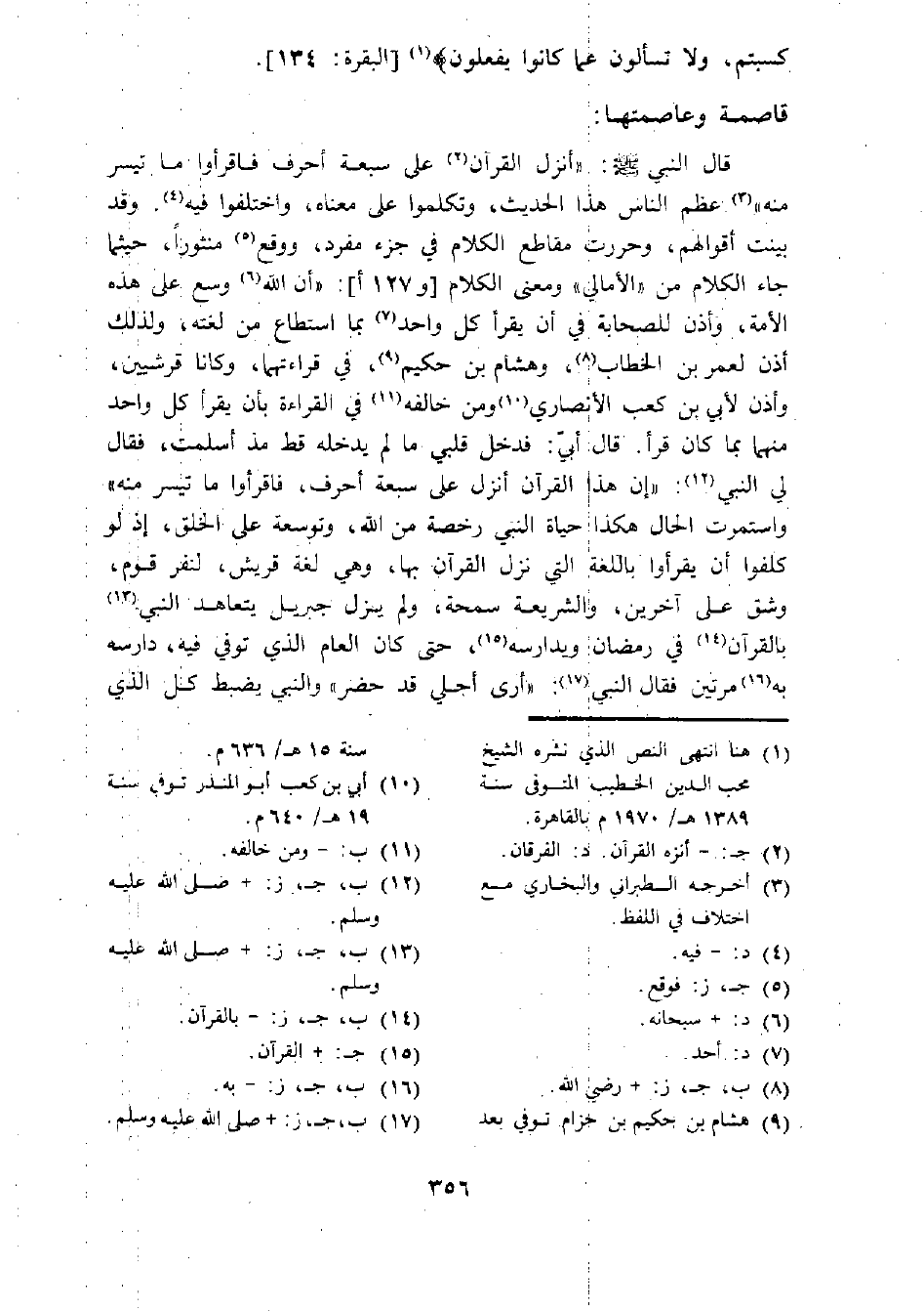 قال النبي - صلى الله عليه وسلم -: "أنزل القرآن (¬2) على سبعة أحرف فاقرأوا ما تيسر منه" (¬3) عظم الناس هذا الحديث، وتكلموا على معناه، واختلفوا فيه (¬4). وقد بينت أقوالهم، وحررت مقاطع الكلام في جزء مفرد، ووقع (¬5) منثورا، حيثما جاء الكلام من "الأمالي" ومعنى الكلام [و 127 أ]: "أن الله (¬6) وسع على هذه الأمة، وأذن للصحابة في أن يقرأ كل واحد (¬7) بما استطاع من لغته، ولذلك أذن لعمر بن الخطاب (¬8)، وهشام بن حكيم (¬9)، في قراءتهما، وكانا قرشيين، وأذن لأبي بن كعب الأنصاري (¬10) ومن خالفه (¬11) في القراءة بأن يقرأ كل واحد منهما بما كان قرأ. قال أبي: فدخل قلبي ما لم يدخله قط مذ أسلمت، فقال لي النبي (¬12): "إن هذا القرآن أنزل على سبعة أحرف، فاقرأوا ما تيسر منه" واستمرت الحال هكذا حياة النبي رخصة من الله، وتوسعة على الخلق، إذ لو كلفوا أن يقرأوا باللغة التي نزل القرآن بها، وهي لغة قريش، لنفر قوم، وشق على آخرين، والشريعة سمحة، ولم يزل جبريل يتعاهد النبي (¬13) بالقرآن (¬14) في رمضان ويدارسه (¬15)، حتى كان العام الذي توفي فيه، دارسه به (¬16) مرتين فقال النبي (¬17): "أرى أجلي قد حضر" والنبي يضبط كل الذي