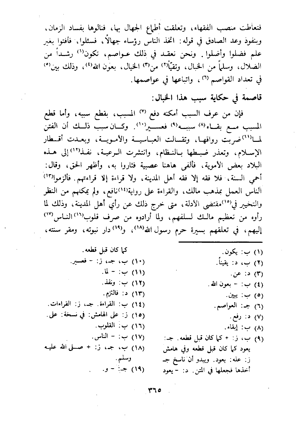 فتعاطت منصب الفقهاء، وتعلقت أطماع الجهال بها، فنالوها بفساد الزمان، وبنفوذ وعد الصادق في قوله: اتخذ الناس رؤساء جهالا، فسئلوا، فأفتوا بغير علم فضلوا وأضلوا. ونحن نعقد في ذلك عواصم، تكون (¬1) رشدا من الضلال، وسلما من الخبال، وتقيا (¬2) من (¬3) الخيال، بعون الله (¬4)، وذلك بين (¬5) في تعداد القواصم (¬6)، واتباعها في عواصمها.