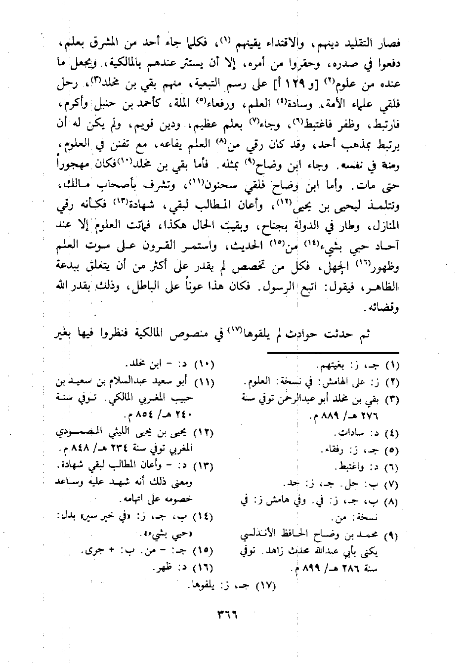 فصار التقليد دينهم، والاقتداء يقينهم (¬1)، فكلما جاء أحد من المشرق بعلم، دفعوا في صدره، وحقروا من أمره، إلا أن يستتر عندهم بالمالكية، ويجعل ما عنده من علوم (¬2) [و 129 أ] على رسم التبعية، منهم بقي بن مخلد (¬3)، رحل فلقي علماء الأمة، وسادة (¬4) العلم، ورفعاء (¬5) الملة، كأحمد بن حنبل وأكرم، فارتبط، وظفر فاغتبط (¬6)، وجاء (¬7) بعلم عظيم، ودين قويم، ولم يكن له أن يرتبط بمذهب أحد، وقد كان رقي من (¬8) العلم يفاعه، مع تفنن في العلوم، [ ... ]. وجاء ابن وضاح (¬9) بمثله. فأما بقي بن مخلد (¬10) فكان مهجورا حتى مات. وأما ابن وضاح فلقي سحنون (¬11)، وتشرف بأصحاب مالك، وتتلمذ ليحيى بن يحيى (¬12)، وأعان الطالب لبقي، شهادة (¬13) فكأنه رقي المنازل، وطار في الدولة بجناح، وبقيت الحال هكذا، فماتت العلوم إلا عند آحاد حبي بشيء (¬14) من (¬15) الحديث، واستمر القرون على موت العلم وظهور (¬16) الجهل، فكل من تخصص لم يقدر على أكثر من أن يتعلق ببدعة الظاهر، فيقول: اتبع الرسول. فكان هذا عونا على الباطل، وذلك بقدر الله وقضائه.