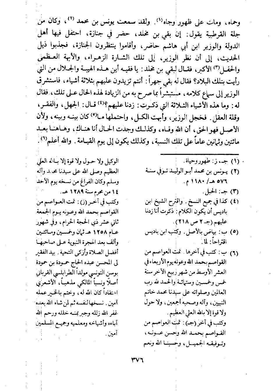 (¬6) ب: كتب في آخرها. تمت العواصم من القواصم بحمد الله وعونه يوم الأربعاء في العشر الأوسط من شهر ربيع الآخر سنة خمس وخمسين وستمائة والحمد لله رب العالمين وصلواته على سيدنا محمد خاتم النبيين، وآله وصحبه أجمعين، ولا حول ولا قوة إلا بالله العلي العظيم. وكتب في آخر (ج): تمت العواصم من القواصم بحمد الله وحسن عونه، وتوفيقه الجميل، وحسبنا الله ونعم الوكيل ولا حول ولا قوة إلا بالله العلي العظيم وصل الله على سيدنا محمد وآله وسلم وكان الفراغ من نسخة يوم الأحد 14 من محرم سنة 1289 م. وكتب في آخر (ز): تمت العواصم من القواصم بحمد الله وعونه يوم الجمعة ثاني عشر ذي الحجة الحرام، وفي شهور عام 1258 هـ ثمان وخمسين ومائتين وألف بعد الهجرة النبوية على صاحبها أفضل الصلاة وأزكى التحية. بيد الفقير لى المحسن عبده الحاج حمودة بن حمودة بوسن التونسي مولدا الطرابلسي القرباني أصلا ونسبا المالكي مذهبا، الأشعري اعتقادا كان الله له، وختم بالخير عمله آمين. نسخها لنفسه ثم لمن شاء الله بعده غفر الله زلله وجبر بنمه خلله ورحم الله آباءه وأشياخه ومعلميه وجميع المسلمين آمين.