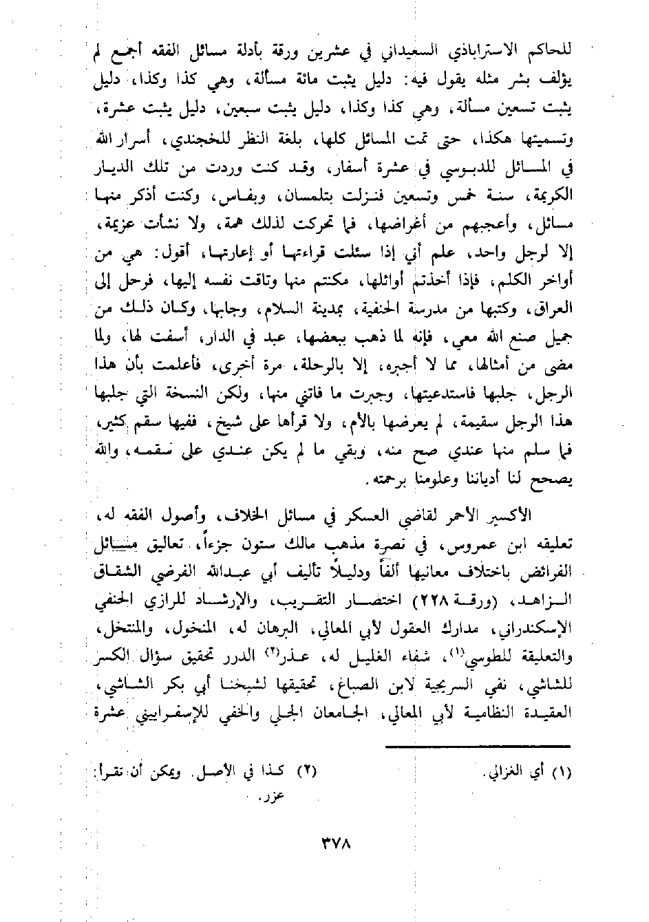 للحاكم الاستراباذي السعيداني في عشرين ورقة بأدلة مسائل الفقه أجمع لم يؤلف بشر مثله يقول فيه: دليل يثبت مائة مسألة، وهي كذا وكذا، دليل يثبت تسعين مسألة، وهي كذا وكذا، دليل يثبت سبعين، دليل يثبت عشرة، وتسميتها هكذا، حتى تمت المسائل كلها، بلغة النظر للخجندي، أسرار الله في المسائل للدبوسي في عشرة أسفار، وقد كنت وردت من تلك الديار الكريمة، سنة خمس وتسعين فنزلت بتلمسان، وبفاس، وكنت أذكر منها مسائل، وأعجبهم من أغراضها، فما تحركت لذلك همة، ولا نشأت عزيمة، إلا لرجل واحد، علم أني إذا سئلت قراءتها أو إعارتها، أقول: هي من أواخر الكلم، فإذا أخذتم أوائلها، مكنتم منها وتاقت نفسه إليها، فرحل إلى العراق، وكتبها من مدرسة الحنفية، بمدينة السلام، وجابها، وكان ذلك من جميل صنع الله معي، فإنه لما ذهب ببعضها، عبد في الدار، أسفت لها، ولما مضى من أمثالها، مما لا أجبره، إلا بالرحلة، مرة أخرى، فأعلمت بأن هذا الرجل، جلبها فاستدعيتها، وجبرت ما فاتني منها، ولكن النسخة التي جلبها هذا الرجل سقيمة، لم يعرضها بالأم، ولا قرأها على شيخ، ففيها سقم كثير، فما سلم منها عندي صح منه، وبقي ما لم يكن عندي على سقمه، والله يصحح لنا أدياننا وعلومنا برحمته.