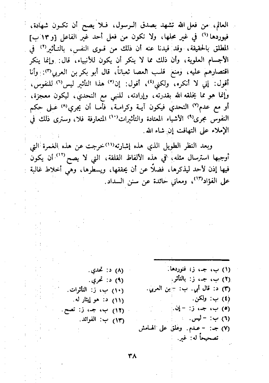 العالم، من فعل الله تشهد بصدق الرسول، فلا يصح أن تكون شهادة، فيوردها (¬1) في غير محلها، ولا تكون من فعل أحد غير الفاعل [و 13ب]، المطلق بالحقيقة، وقد قيدنا عنه أن ذلك من قوى النفس، بالتأثير (¬2) في الأجسام العلوية، وأن ذلك مما لا ينكر أن يكون للأنبياء، قال: وإنما ينكر اقتصارهم عليه، ومنع قلب العصا ثعبانا، قال أبو بكر بن العربي (¬3): وأنا أقول: إني لا أنكره، ولكني (¬4)، أقول: إن (¬5) هذا التأثير ليس (¬6) للنفوس، وإنما هو مما يخلقه الله بقدرته، وإرادته، للنبي مع التحدي، ليكون معجزة، أو مع عدم (¬7) التحدي فيكون آية وكرامة، فأما أن يجري (¬8) على حكم النفوس مجرى (¬9) الأشياء المعتادة والتأثيرات (¬10) المتعارفة فلا، وسترى ذلك في الإملاء على التهافت إن شاء الله.