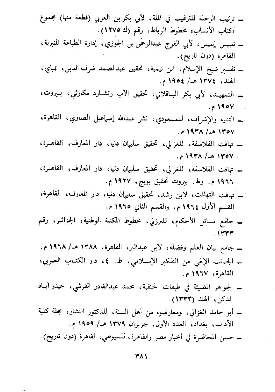 -تهافت الفلاسفة، للغزالي، تحقيق سليمان دنيا، دار المعارف، القاهرة، 1357 هـ/ 1938م.