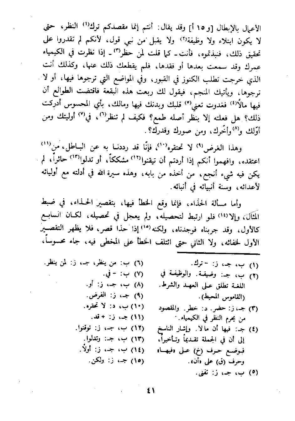الأعمال بالإبطال [و 15 أ]، وقد يقال: أنتم إنما مقصدكم ترك (¬1) النظر، حتى لا يكون ابتلاء ولا وظيفة (¬2) ولا يقبل من نبي قول، لأنكم لم تقدروا على تحقيق ذلك، فنبذتموه، فأنت - كما قلت لمن حظر (¬3) - إذا نظرت في الكيمياء عمرك وقد سمعت بعدها أو فقدها، فلم يقطعك ذلك عنها، وكذلك أنت الذي خرجت تطلب الكنوز في القبور، وفي المواضع التي ترجوها فيها، أو لا ترجوها، ويأتيك المنجم، فيقول لك ربعت هذه البقعة فاقتضت الطوالع أن فيها مالا (¬4) فغدوت تعني (¬5) قلبك وبدنك فيها ومالك، بأي المحسوس أدركت ذلك؟ هل فعلته إلا بنظر أصله طمع؟ فكيف لم تنظم (¬6)، في (¬7) أوليتك ومن أولك و (¬8) وأخرك، ومن صورك وقدرك؟.