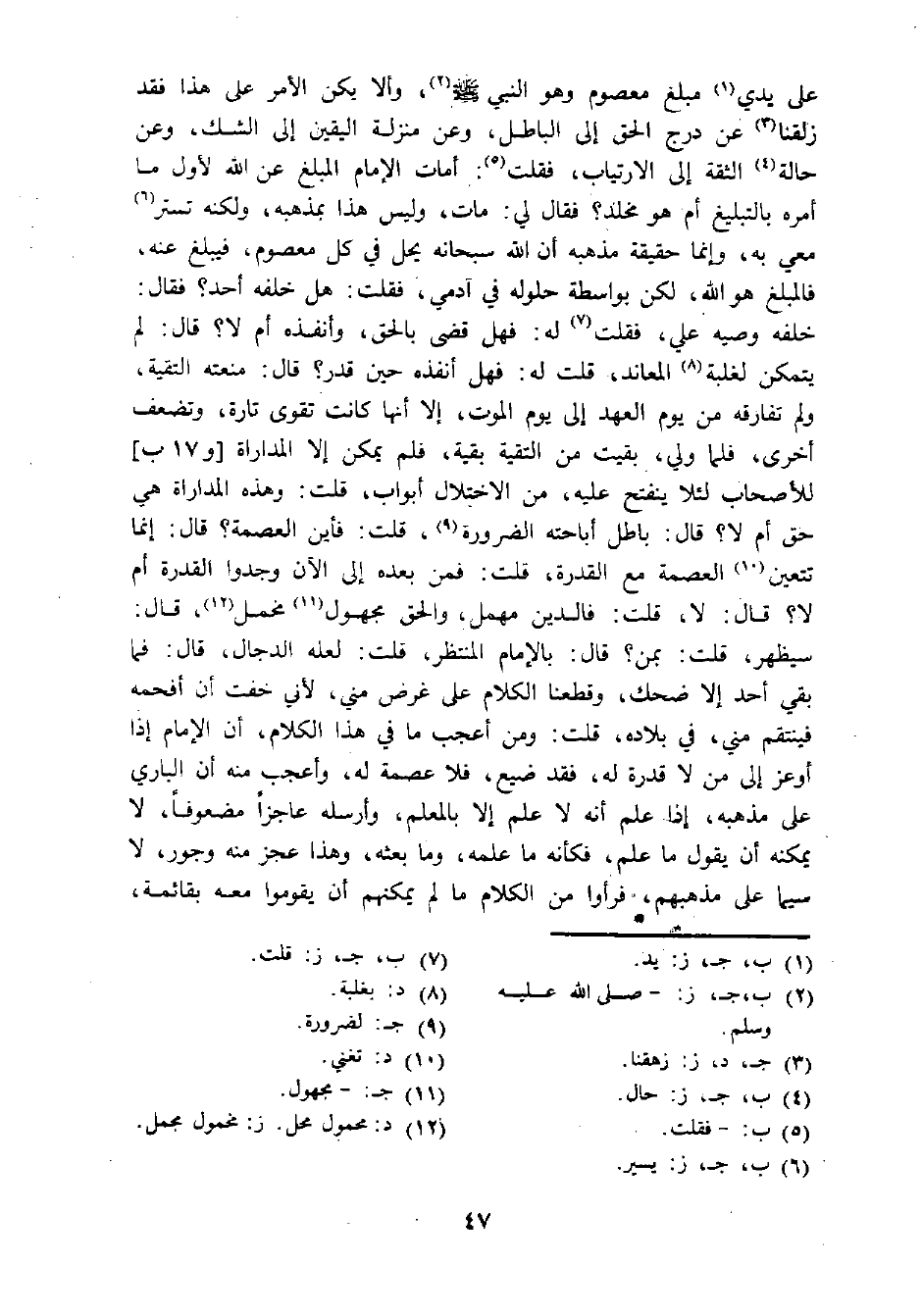 على يدي (¬1) مبلغ معصوم وهو النبي - صلى الله عليه وسلم - (¬2)، وألا يكن الأمر على هذا فقد زلقنا (¬3) عن درج الحق إلى الباطل، وعن منزلة اليقين إلى الشك، وعن حالة (¬4) الثقة إلى الارتياب، فقلت (¬5): أمات الإمام المبلغ عن الله لأول ما أمره بالتبليغ أم هو مخلد؟ فقال لي: مات، وليس هذا بمذهبه، ولكنه تستر (¬6) معي به، وإنما حقيقة مذهبه أن الله سبحانه يحل في كل معصوم، فيبلغ عنه، فالمبلغ هوالله، لكن بواسطة حلوله في آدمي، فقلت: هل خلفه أحد؟ فقال: خلفه وصيه علي، فقلت (¬7) له: فهل قضى بالحق، وأنفذه أم لا؟ قال: لم يتمكن لغلبة (¬8) المعاند، قلت له: فهل أنفذه حين قدر؟ قال: منعته التقية، ولم تفارقه من يوم العهد إلى يوم الموت، إلا أنها كانت تقوى تارة، وتضعف أخرى، فلما ولي، بقيت من التقية بقية، فلم يمكن إلا المداراة [و 17 ب] للأصحاب لئلا ينفتح عليه، من الاختلال أبواب، قلت: وهذه المداراة هي حق أم لا؟ قال: باطل أباحته الضرورة (¬9)، قلت: فأين العصمة؟ قال: إنما تتعين (¬10) العصمة مع القدرة، قلت: فمن بعده إلى الآن وجدوا القدرة أم لا؟ قال: لا، قلت: فالدين مهمل، والحق مجهول (¬11) مخمل (¬12)، قال: سيظهر، قلت: بمن؟ قال: بالإمام المنتظر، قلت: لعله الدجال، قال: فما بقي أحد إلا ضحك، وقطعنا الكلام على غرض مني، لأني خفت أن أفحمه فينتقم مني، في بلاده، قلت: ومن أعجب ما في هذا الكلام، أن الإمام إذا أوعز إلى من لا قدرة له، فقد ضيع، فلا عصمة له، وأعجب منه أن الباري على مذهبه، إذا علم أنه لا علم إلا بالمعلم، وأرسله عاجزا مضعوفا، لا يمكنه أن يقول ما علم، فكأنه ما علمه، وما بعثه، وهذا عجز منه وجور، لا سيما على مذهبهم، فرأوا من الكلام ما لم يمكنهم أن يقوموا معه بقائمة،
