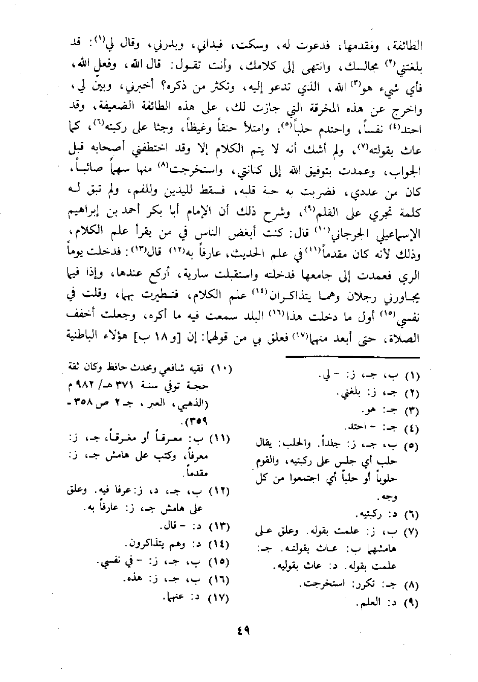 الطائفة، ومقدمها، فدعوت له، وسكت، فبداني، وبدرني، وقال لي (¬1): قد بلغتني (¬2) مجالسك، وانتهى إلى كلامك، وأنت تقول: قال الله، وفعل الله، فأي شيء هو (¬3) الله، الذي تدعو إليه، وتكثر من ذكره؟ أخبرني، وبين لي، واخرج عن هذه المخرقة التي جازت لك، على هذه الطائفة الضعيفة، وقد احتد (¬4) نفسا، واحتدم حلبا (¬5)، وامتلأ حنقا وغيظا، وجثا على ركبته (¬6)، كما عاث بقولته (¬7)، ولم أشك أنه لا يتم الكلام إلا وقد اختطفني أصحابه قبل الجواب، وعمدت بتوفيق الله إلى كنانتي، واستخرجت (¬8) منها سهما صائبا، كان من عددي، فضربت به حبة قلبه، فسقط لليدين وللفم، ولم تبق له كلمة تجري على القلم (¬9)، وشرح ذلك أن الإمام أبا بكر أحمد بن إبراهيم الإسماعيلي الجرجاني (¬10) قال: كنت أبغض الناس في من يقرأ علم الكلام، وذلك لأنه كان مقدما (¬11) في علم الحديث، عارفا به (¬12) قال (¬13): فدخلت يوما الري فعمدت إلى جامعها فدخلته واستقبلت سارية، أركع عندها، وإذا فيما يجاورني رجلان وهما يتذاكران (¬14) علم الكلام، فتطيرت بهما، وقلت في نفسي (¬15) أول ما دخلت هذا (¬16) البلد سمعت فيه ما أكره، وجعلت أخفف الصلاة، حتى أبعد منهما (¬17) فعلق بي من قولهما: إن [و 18 ب]، هؤلاء الباطنية