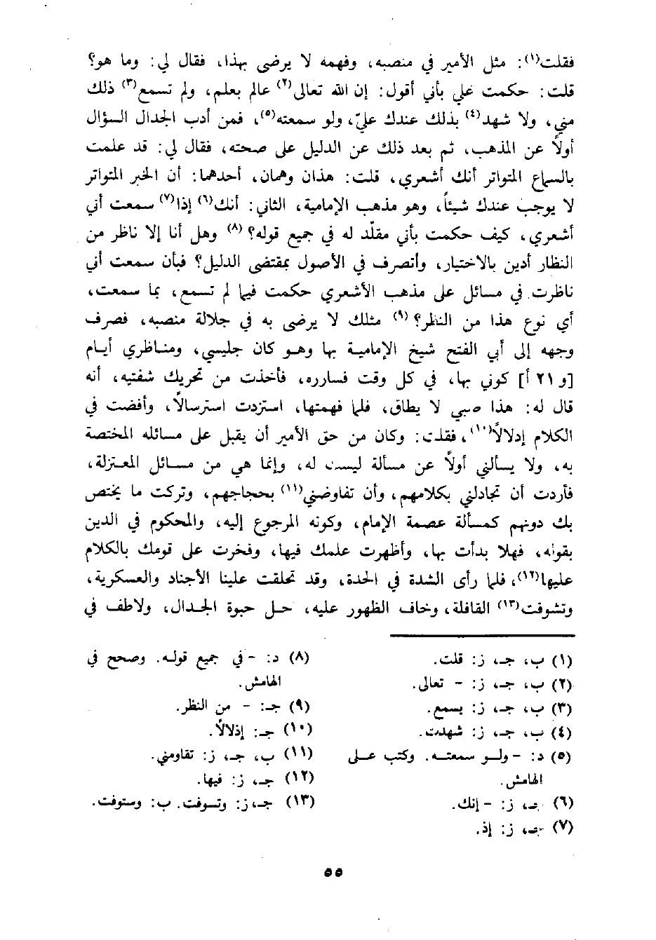 فقلت (¬1): مثل الأمير في منصبه، وفهمه لا يرضى بهذا، فقال لي: وما هو؟ قلت: حكمت علي بأني أقول: إن الله تعالى (¬2) عالم بعلم، ولم تسمع (¬3) ذلك مني، ولا شهد (¬4) بذلك عندك علي، ولو سمعته (¬5)، فمن أدب الجدال السؤال أولا عن المذهب، ثم بعد ذلك عن الدليل على صحته، فقال لي: قد علمت بالسماع المتواتر أنك أشعري، قلت: هذان وهمان، أحدهما: أن الخبر المتواتر لا يوجب عندك شيئا، وهو مذهب الإمامية، الثاني: أنك (¬6) إذا (¬7) سمعت أني أشعري، كيف حكمت بأني مقلد له في جميع قوله؟ (¬8) وهل أنا إلا ناظر من النظار أدين بالاختيار، وأتصرف في الأصول بمقتضى الدليل؟ فبأن سمعت أني ناظرت في مسائل على مذهب الأشعري حكمت فيما لم تسمع، بما سمعت، أي نوع هذا من النظر؟ (¬9) مثلك لا يرضى به في جلالة منصبه، فصرف وجهه إلى أبي الفتح شيخ الإمامية بها وهو كان جليسي، ومناظري أيام [و 21 أ] كوني بها، في كل وقت فسارره، فأخذت من تحريك شفتيه، أنه قال له: هذا صبي لا يطاق، فلما فهمتها، استزدت استرسالا، وأفضت في الكلام إدلالا (¬10)، فقلت: وكان من حق الأمير أن يقبل على مسائله المختصة به، ولا يسألني أولا عن مسألة ليست له، وإنما هي من مسائل المعتزلة، فأردت أن تجادلني بكلامهم، وأن تفاوضني (¬11) بحجاجهم، وتركت ما يختص بك دونهم كمسألة عصمة الإمام، وكونه المرجوع إليه، والمحكوم في الدين بقوله، فهلا بدأت بها، وأظهرت علمك فيها، وفخرت على قومك بالكلام عليها (¬12)، فلما رأى الشدة في الحدة، وقد تحلقت علينا الأجناد والعسكرية، وتشوفت (¬13) القافلة، وخاف الظهور عليه، حل حبوة الجدال، ولاطف في