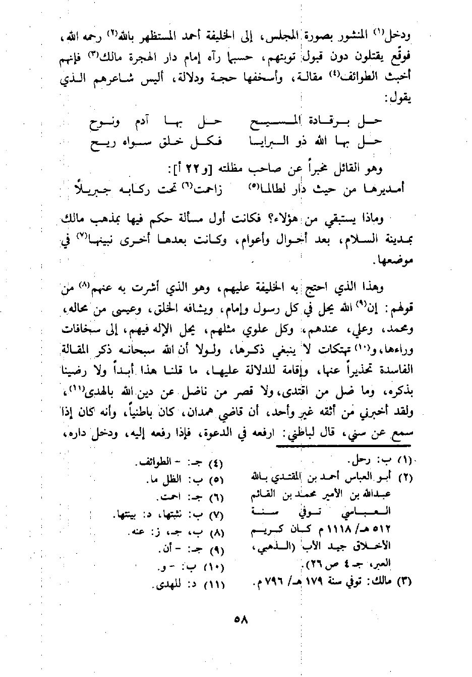ودخل (¬1) المنشور بصورة المجلس، إلى الخليفة أحمد المستظهر ب الله (¬2) رحمه الله، فوقع يقتلون دون قبول توبتهم، حسبما رآه إمام دار الهجرة مالك (¬3) فإنهم أخبث الطوائف (¬4) مقالة، وأسخفها حجة ودلالة، أليس شاعرهم الذي يقول: