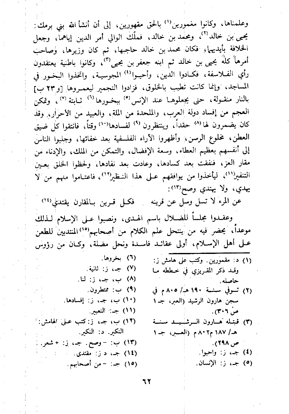 وعلمناها، وكانوا مغمورين (¬1) بالحق مقهورين، إلى أن أنشأ الله بني برمك: يحيى بن خالد (¬2)، ومحمد بن خالد، فملك الوالي أمر الدين إياهما، وجعل الخلافة بأيديهما، فكان محمد بن خالد حاجبها، ثم كان وزيرها، وصاحب أمرها كله يحيى بن خالد ثم ابنه جعفر بن يحيى (¬3)، وكانوا باطنية يعتقدون رأي الفلاسفة، فكادوا الدين، وأحيوا (¬4) المجوسية، واتخذوا البخور في المساجد، وإنما كانت تطيب بالخلوق، فزادوا التجمير ليعمروها [و 23 ب]، بالنار منقولة، حتى يجعلوها عند الإنس (¬5) ببخورها (¬6) ثابتة (¬7)، وتمكن العجم من إفساد دولة العرب، والملحدة من الملة، والعبيد من الأحرار، وقد كان يضمرون لها (¬8) حقدا، وينتظرون (¬9) لفسادها (¬10) وقتا، فانتقوا كل ضيق العطن، مخلوع الرسن، وأظهروا الآراء الفلسفية بعد خفائها، وجلبوا الناس إلى أنفسهم بعظيم العطاء، وسعة الإفضال، والتمكن من الملك، والإدناء من مقار العز، فنفقت بعد كسادها، وعادت بعد نفادها، ولحظوا الخلق بعين التنفير (¬11)، ليأخذوا من يوافقهم على هذا النظير (¬12)، فاعتاموا منهم من لا يهدي، ولا يهتدي وصح (¬13):