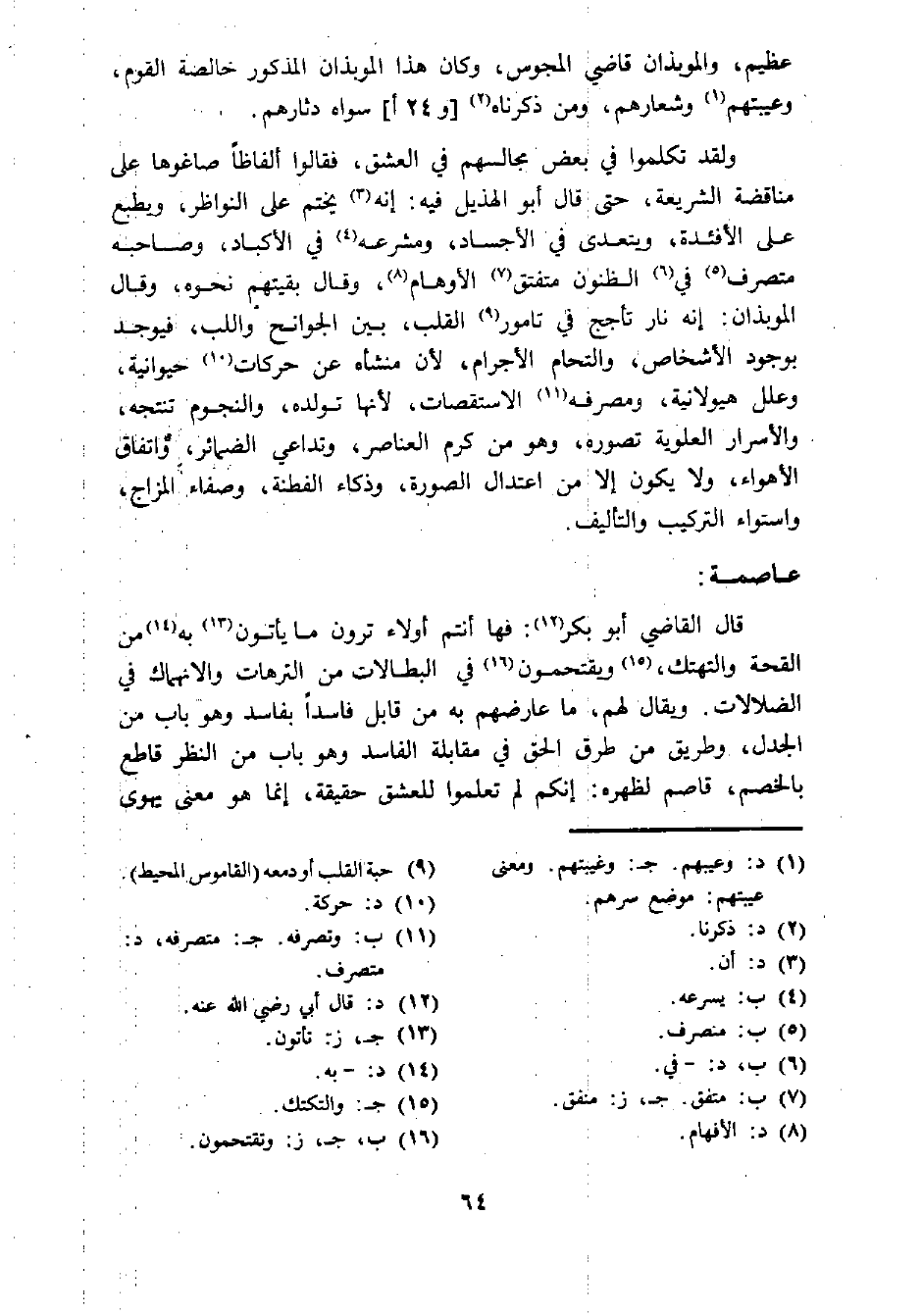 ولقد تكلموا في بعض مجالسهم في العشق، فقالوا ألفاظا صاغوها على مناقضة الشريعة، حتى قال أبو الهذيل فيه: إنه (¬3) يختم على النواظر، ويطبع على الأفئدة، ويتعدى في الأجساد، ومشرعه (¬4) في الأكباد، وصاحبه متصرف (¬5) في (¬6) الظنون متفتق (¬7) الأوهام (¬8)، وقال بقيتهم نحوه، وقال الموبذان: إنه نار تأجج في تامور (¬9) القلب، بين الجوانح واللب، فيوجد بوجود الأشخاص، والتحام الأجرام، لأن منشأه عن حركات (¬10) حيوانية، وعلل هيولانية، ومصرفه (¬11) الاستقصات، لأنها تولده، والنجوم تنتجه، والأسرار العلوية تصوره، وهو من كرم العناصر، وتداعي الضمائر، واتفاق الأهواء، ولا يكون إلا من اعتدال الصورة، وذكاء الفطنة، وصفاء المزاج، واستواء التركيب والتأليف.
