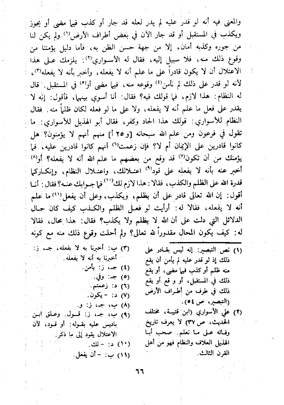 (¬1) نص التبصير: إنه ليس بقادر على ذلك إذ لو قدر عليه لم يأمن أن يقع منه ظلم أو كذب فيما مضى، أو يقع ذلك في المستقبل، أو وقع أو يقع ذلك في طرف من أطراف الأرض (التبصير، ص 54).