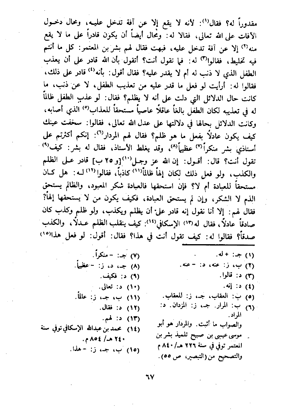 مقدورا له؟ فقال (¬1): لأنه لا يقع إلا عن آفة تدخل عليه، ومحال دخول الآفات على الله تعالى، فقالا له: ومحال أيضا أن يكون قادرا على ما لا يقع منه (¬2) إلا عن آفة تدخل عليه، فبهت فقال لهم بشر بن المعتمر: كل ما أنتم فيه تخليط، فقالوا (¬3) له: فما تقول أنت؟ أتقول بأن الله قادر على أن يعذب الطفل الذي لا ذنب له أم لا يقدر عليه؟ فقال أقول: بأنه (¬4) قادر على ذلك، فقالوا له: أرأيت لو فعل ما قدر عليه من تعذيب الطفل، لا عن ذنب، ما كانت حال الدلائل التي دلت على أنه لا يظلم؟ فقال: لو عذب المطفل ظالما له في تعذيبه لكان الطفل بالغا عاقلا عاصيا مستحقا للعذاب (¬5) الذي أصابه، وكانت الدلائل بحالها في دلالتها على عدل الله تعالى، فقالوا: سخفت عينك كيف يكون عادلا بفعل ما هو ظلم؟ فقال لهم المردار (¬6): إنكم أكثرتم على أستاذي بشر منكرا (¬7) عظيما (¬8)، وقد يغلط الأستاذ، فقال له بشر: كيف (¬9) تقول أنت؟ قال: أقول: إن الله عز وجل (¬10) [و 25 ب] قادر على الظلم والكذب، ولو فعل ذلك لكان إلها ظالما (¬11) كاذبا، فقالوا (¬12) له: هل كان مستحقا للعبادة أم لا؟ فإن استحقها فالعبادة شكر المعبود، والظالم يستحق الذم لا الشكر، وإن لم يستحق العبادة، فكيف يكون من لا يستحقها إلها؟ فقال لهم: إلا أنا نقول إنه قادر على أن يظلم ويكذب، ولو ظلم وكذب كان صادقا عادلا، فقال له (¬13) الإسكافي (¬14): كيف ينقلب الظلم عدلا، والكذب صدقا؟ فقالوا له: كيف تقول أنت في هذا؟ فقال: أقول: لو فعل هذا (¬15)