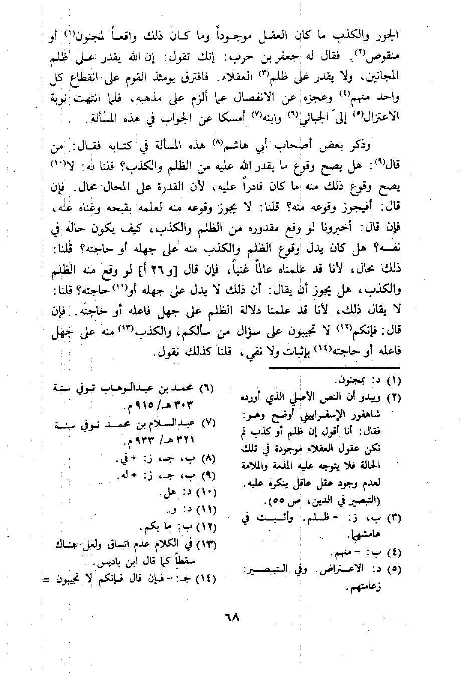 (¬2) ويبدو أن النص الأصلي الذي أورده شاهفور الإسفراييني أوضح وهو: فقال: أنا أقول إن ظلم أو كذب لم تكن عقول العقلاء موجودة في تلك الحالة فلا يتوجه عليه المذمة والملامة لعدم وجود عقل عاقل ينكره عليه. (التبصير في الدين، ص 55).